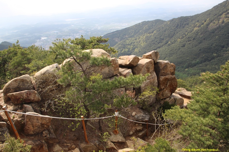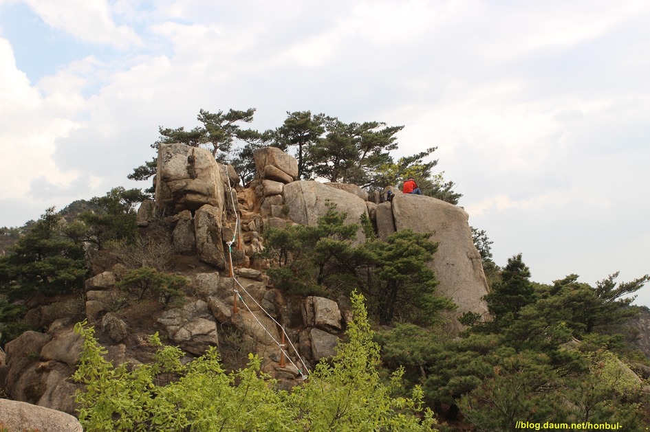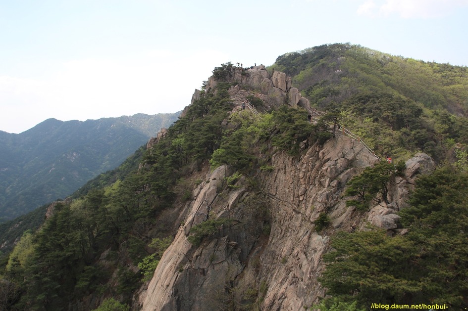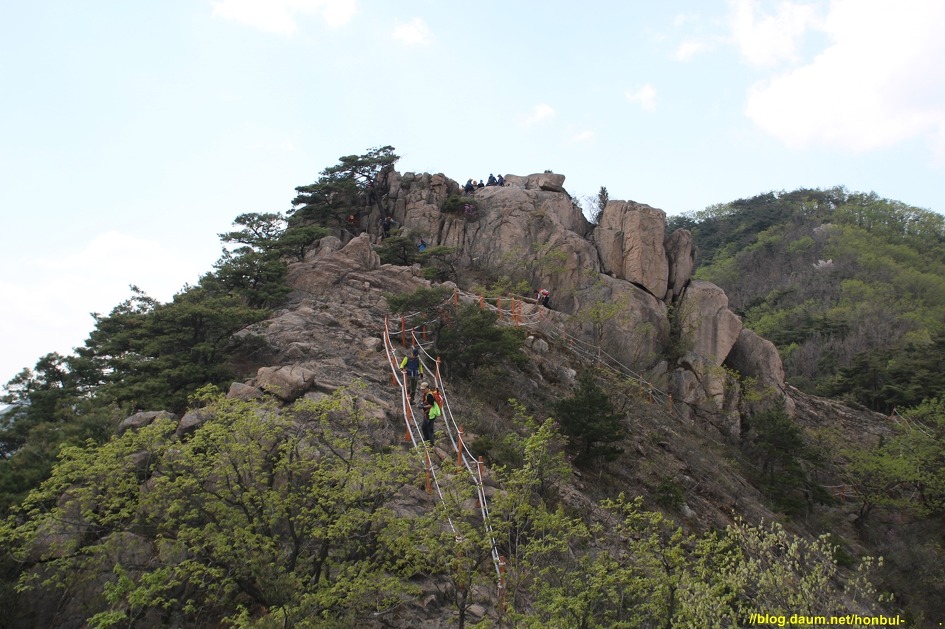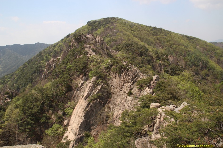 그 암봉 위로 양 옆엔 로프로 위험구간을 안전하게 지나갈 수 있게 설치한 걸 볼 수 있다.