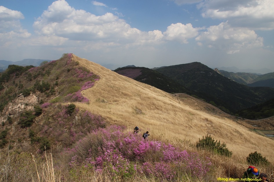 진달래의 장관을 보기 위해 능선을 따라 난 길이 억새와 진달래군락지를 갈라놓는다.