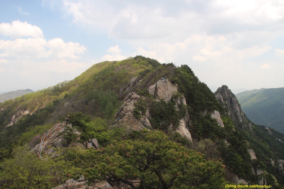 그 암봉 위로 양 옆엔 로프로 위험구간을 안전하게 지나갈 수 있게 설치한 걸 볼 수 있다.