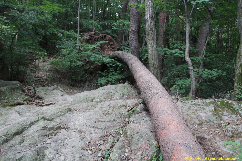 바위 위에 자라던 소나무 뿌리가 깊지 못해 바람에 쓰러진 것이다.