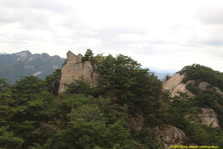 좀 전 미륵봉과 비슷한 모양의 바위에 다시 나타났는데, 머리 두세 개가 겹쳐 보인다.
