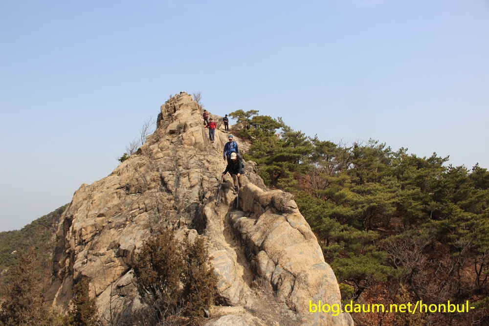 릿지를 잘하면 그리 오르면 되지만, 오른쪽은 제법 낭떠러지로 경사가 기울어 위험스럽기 짝이 없다.