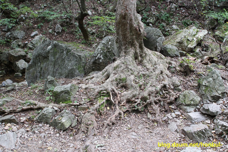나무 뿌리가 바위를 연상케 할만큼 넓게 퍼지다 각각의 뿌리가 흙 속으로 파고 들었다.