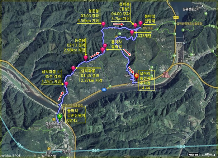 지난번 산행은 강촌삼거리에서 시작해 정상에서 등산로가 가파른 의암호로 떨어지며 6시간 15분 걸렸다.