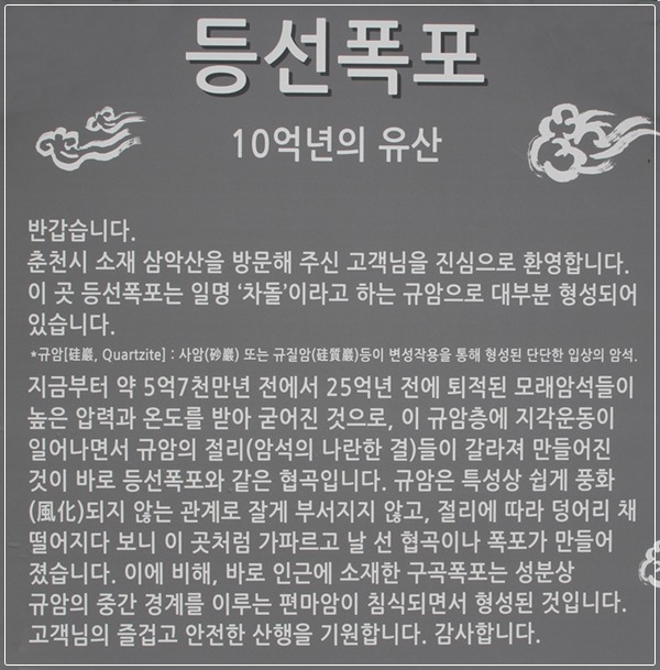 등선폭포 안내문에 차돌(규암)이 대부분 등선폭포를 이루는 암석이라고 한다.