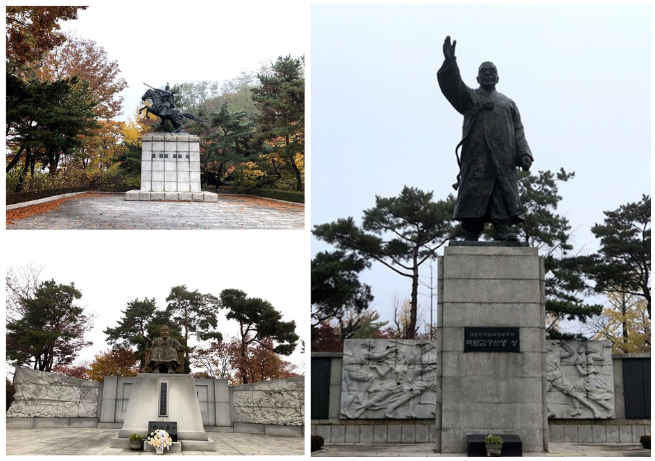 공원 입구엔 김유신 장군, 성재 이시영 선생, 백범 김구의 동상이 있다.