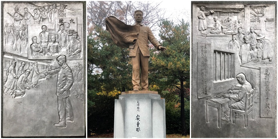 안중근 의사 동상과 동상 기단에 설치된 조각