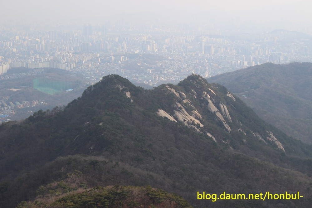 아우봉에서 지나온 곳의 제일 선명하고 가까운 백악산과 한칸 건너 인왕산, 그 뒤로 안산이 보인다.