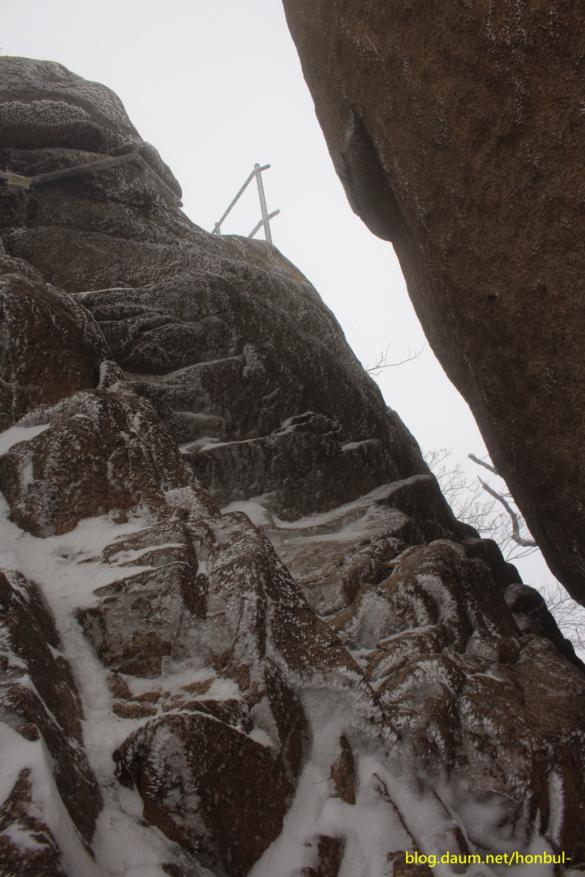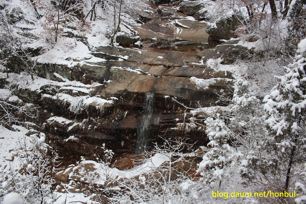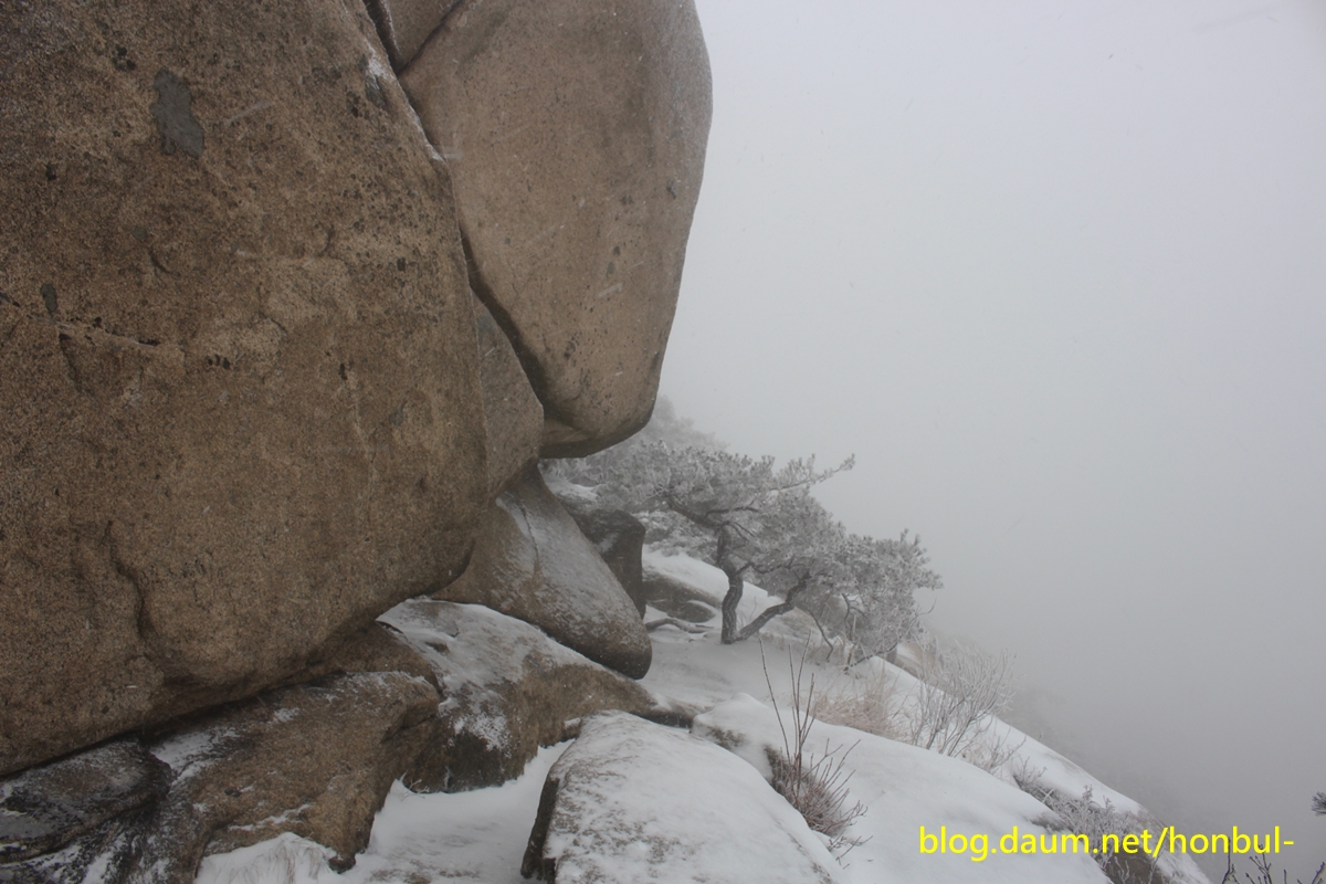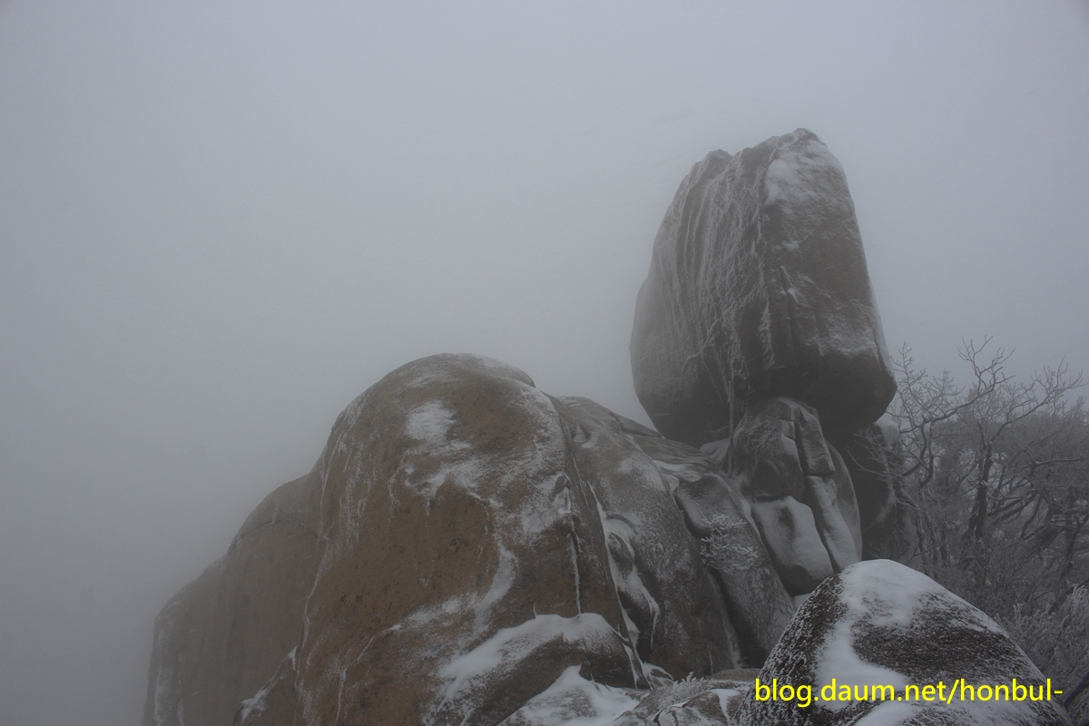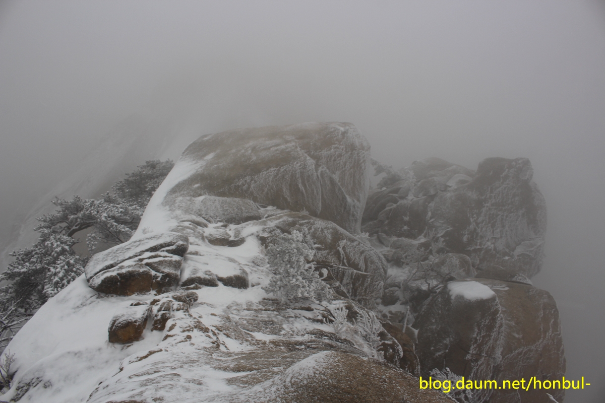 바위엔 살짝 눈을 남겨놓은 채 시커멓게 언 바위가 을씨년스럽다.