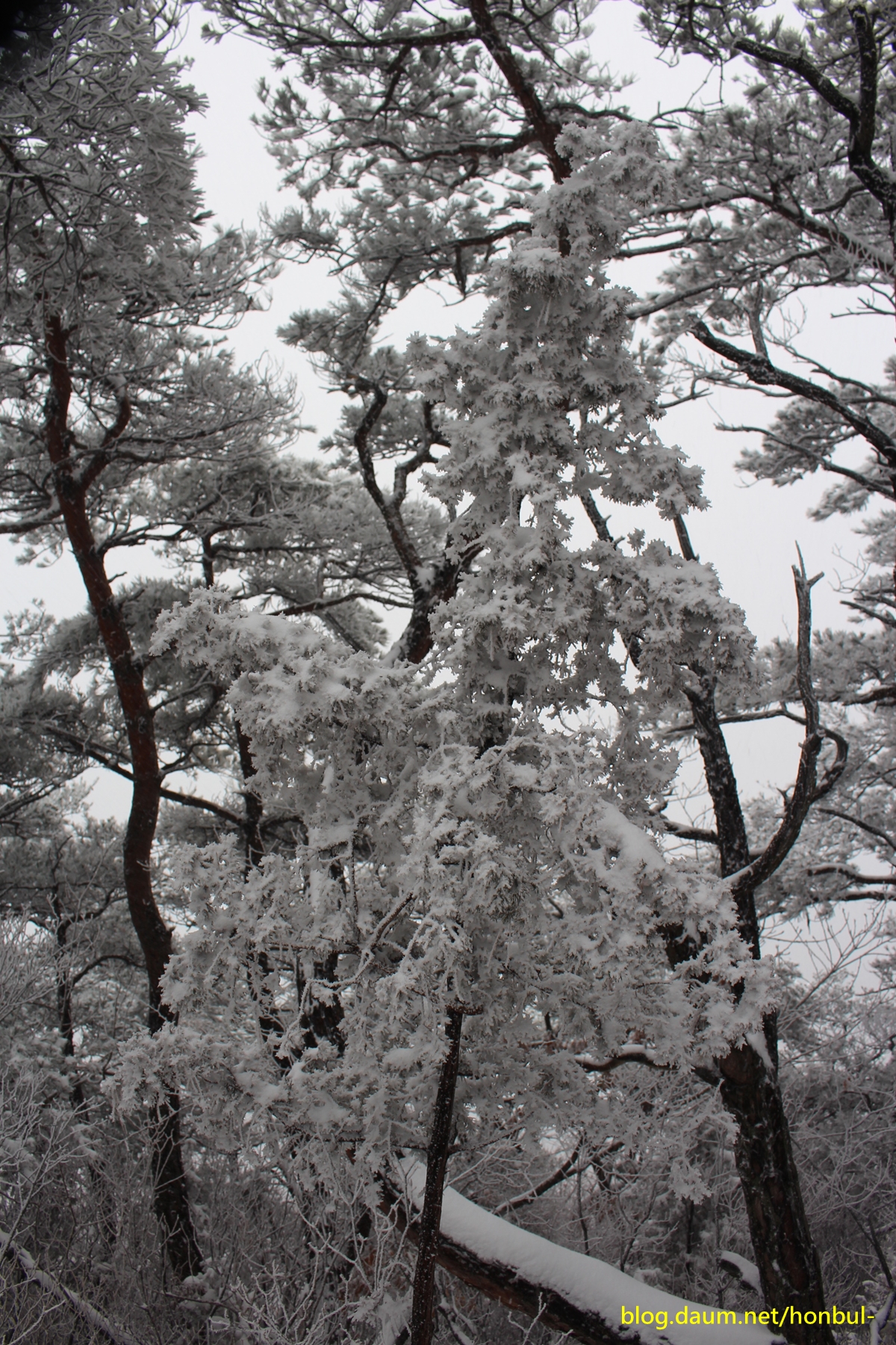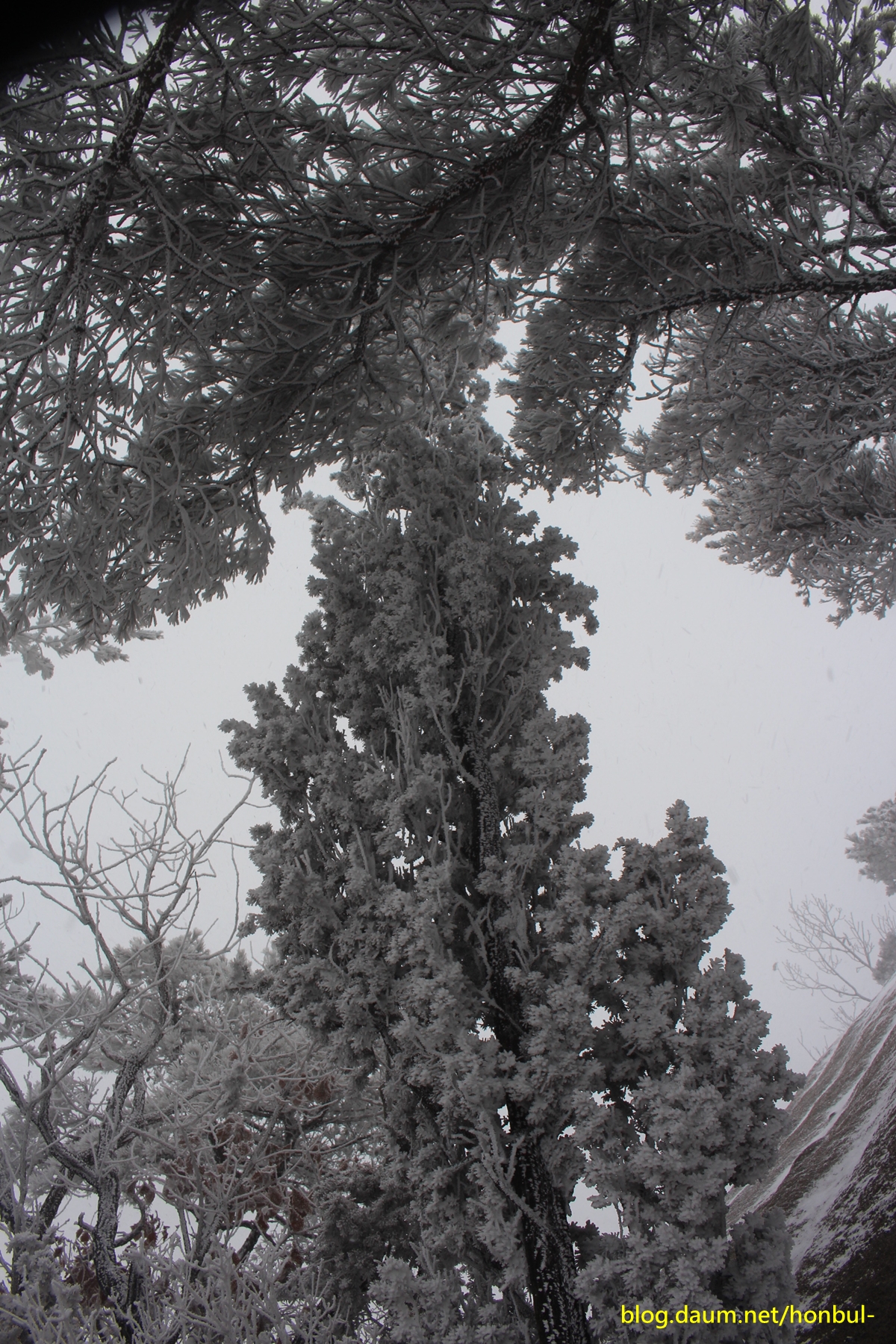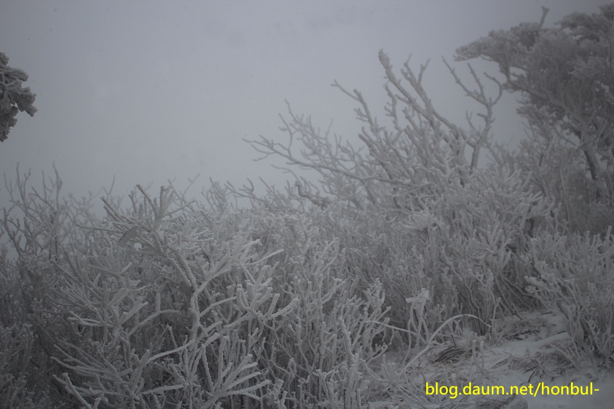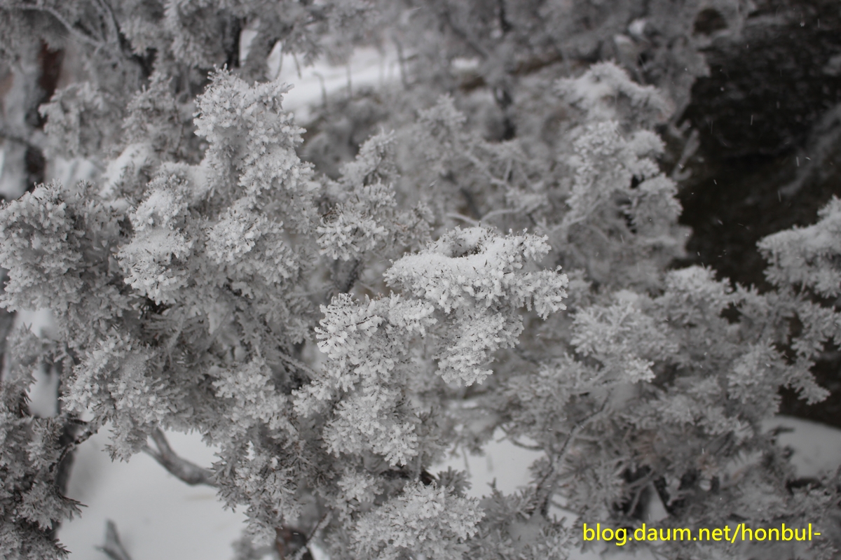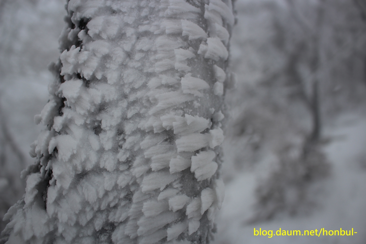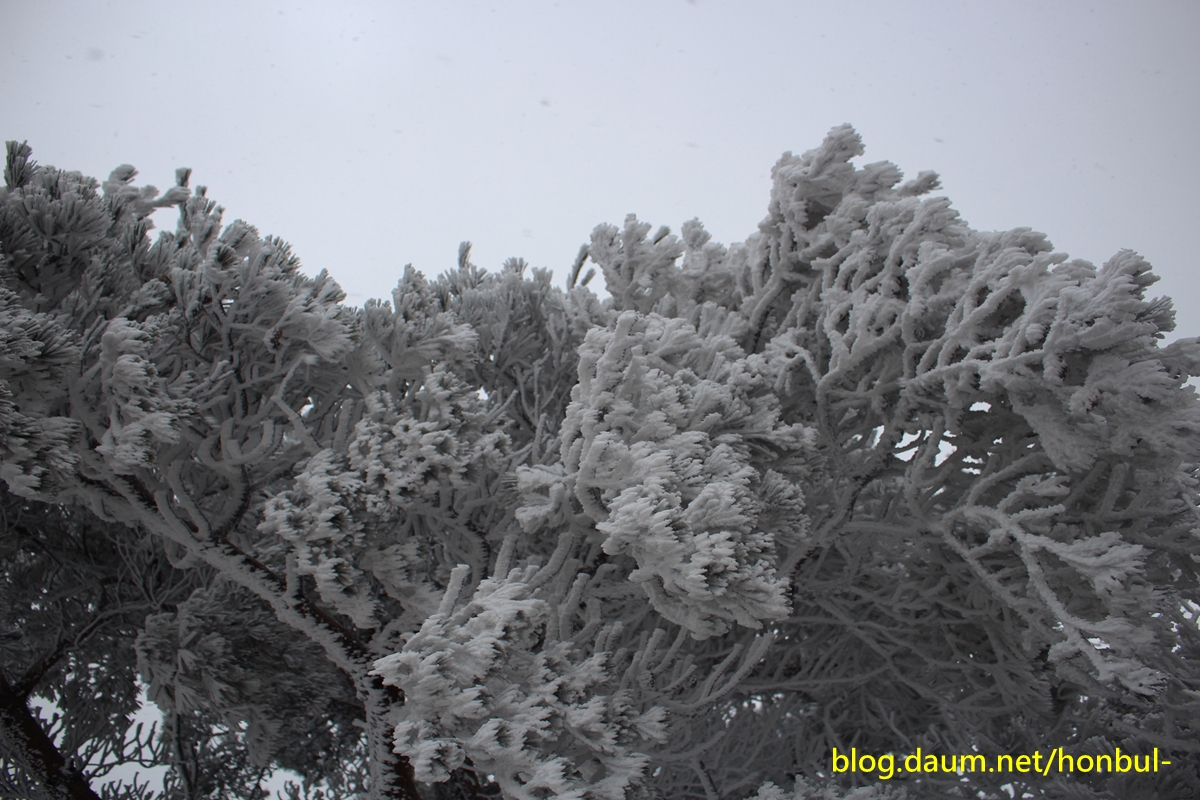 올라갈수록 나무엔 눈이 점점 많아지더니 더 위쪽엔 아예 상고대가 장관이다.