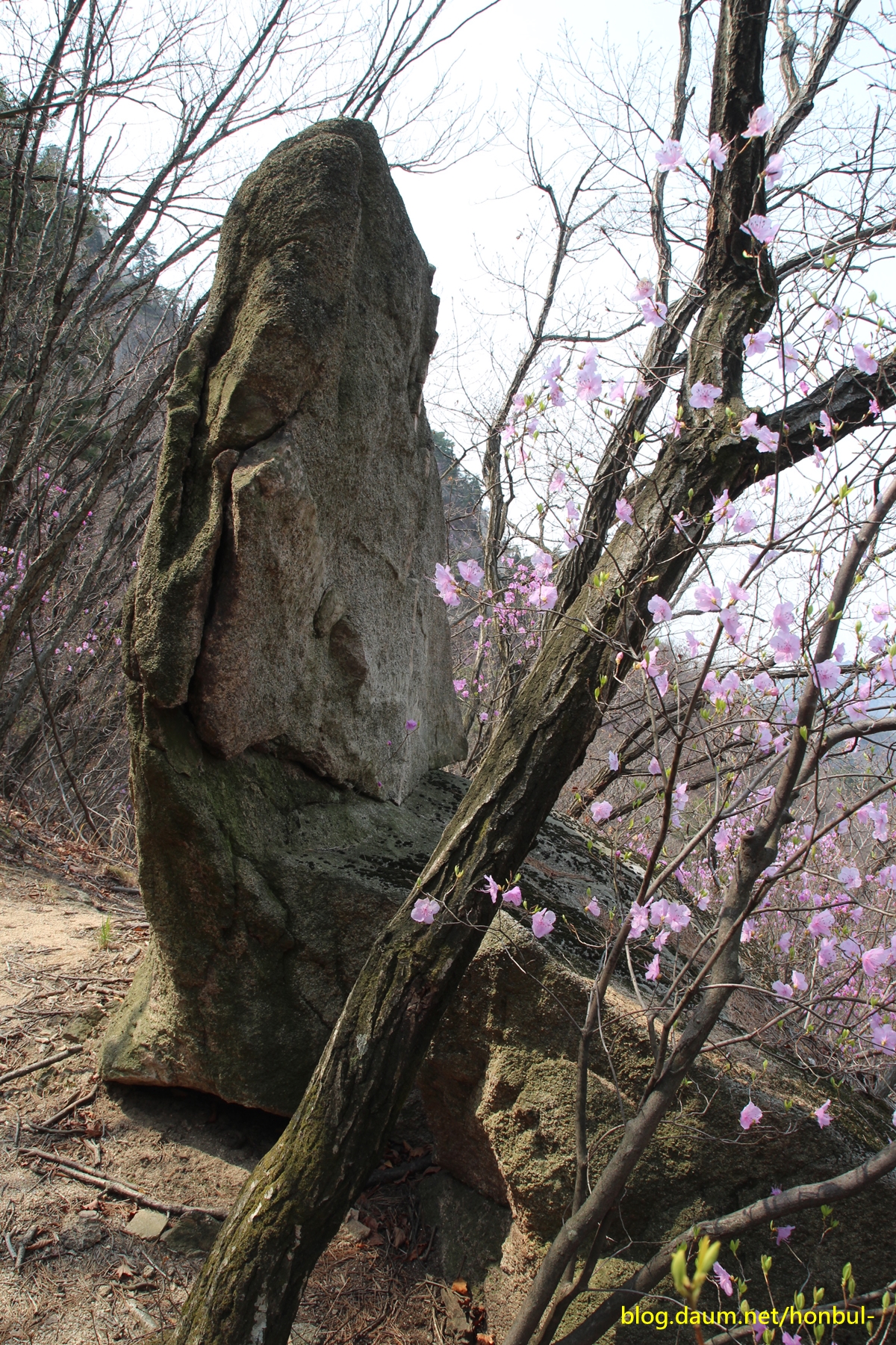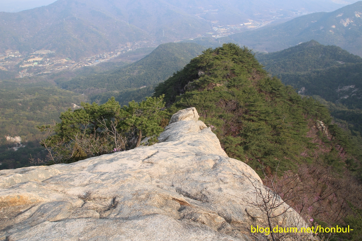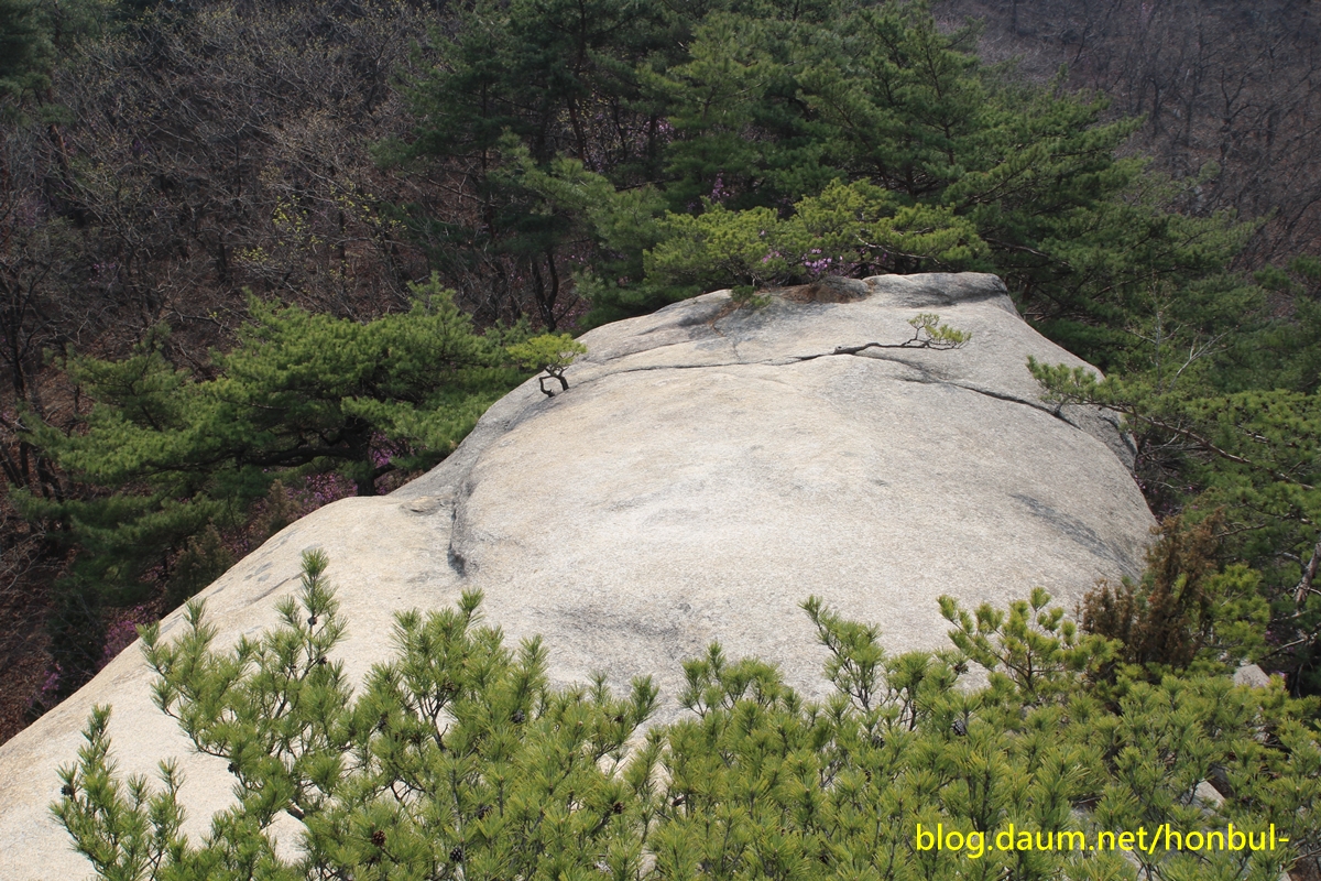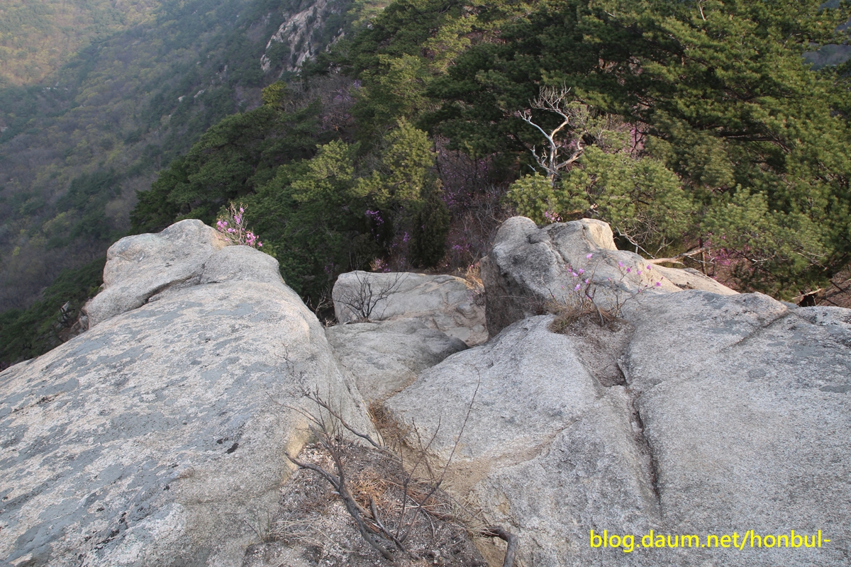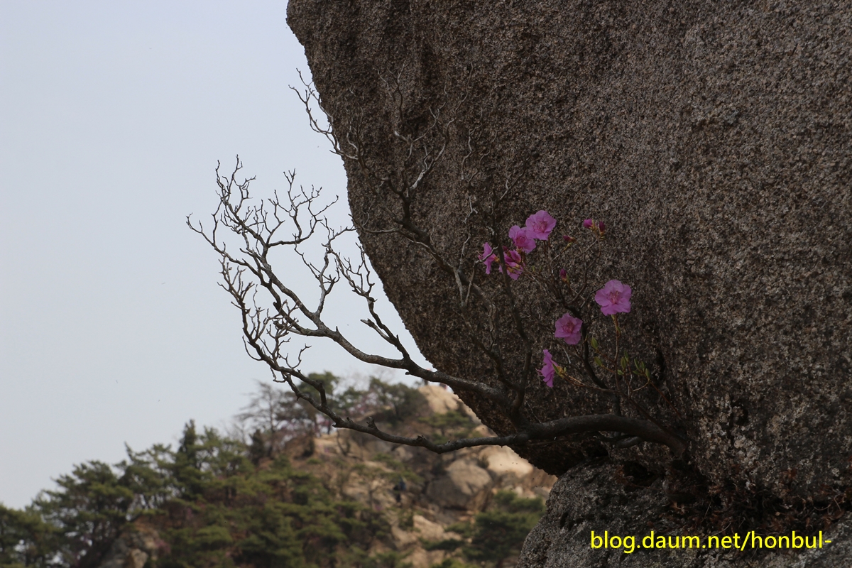 엄지바위(동자바위) 중간 왼쪽에 진달래꽃이 핀 게 보인다.