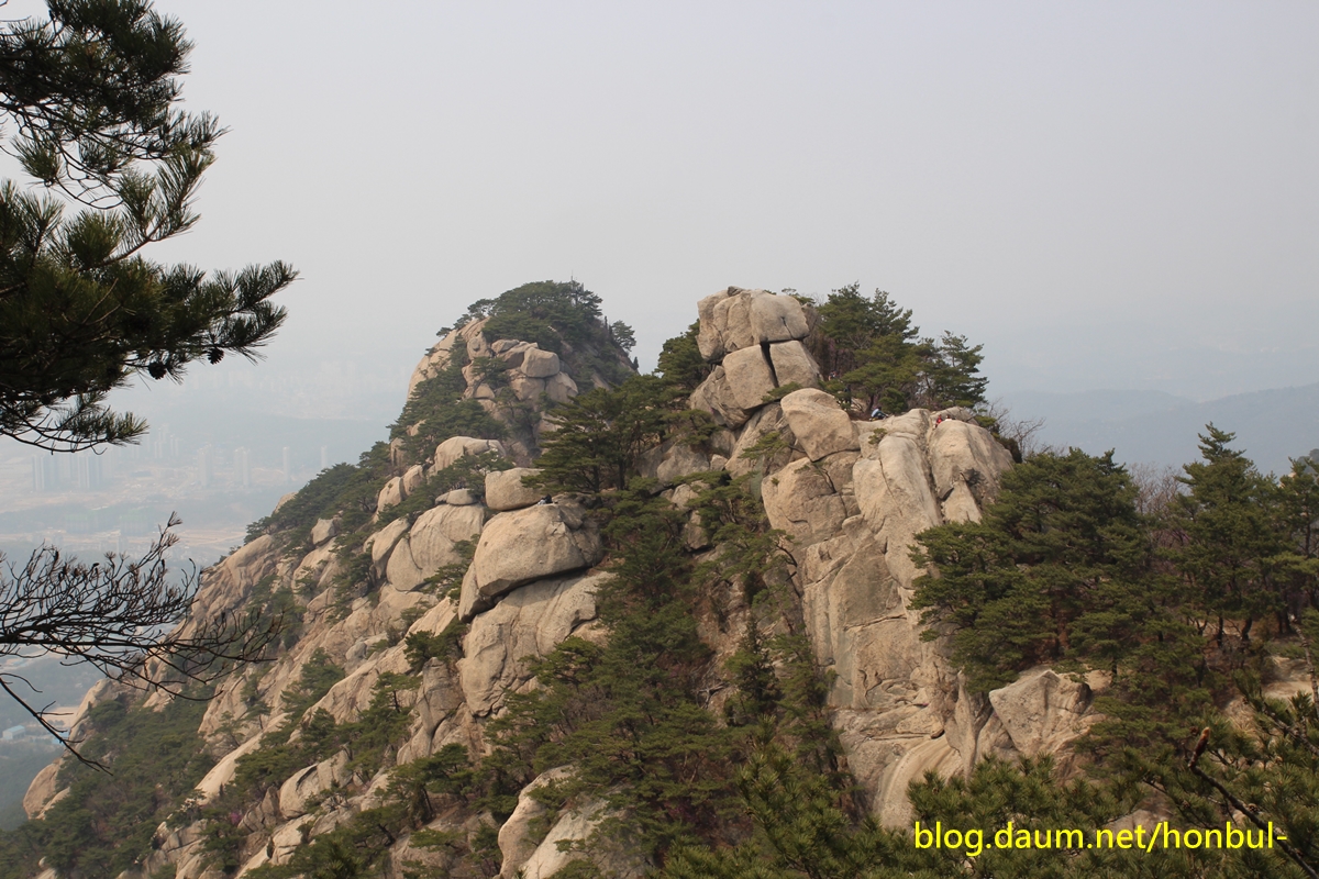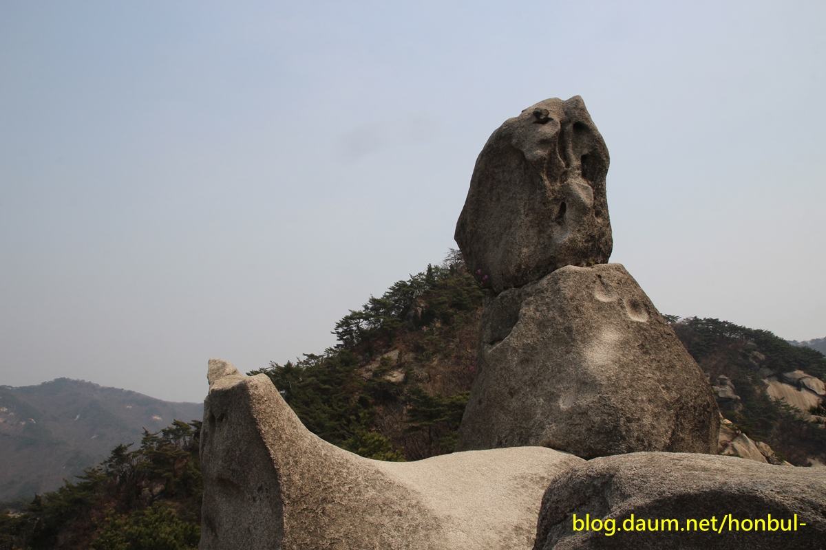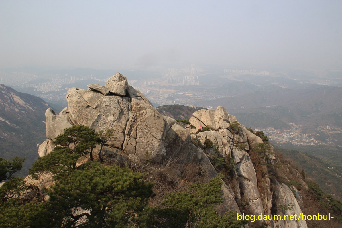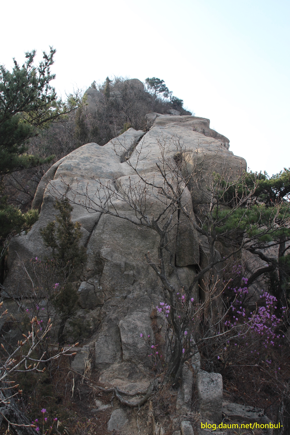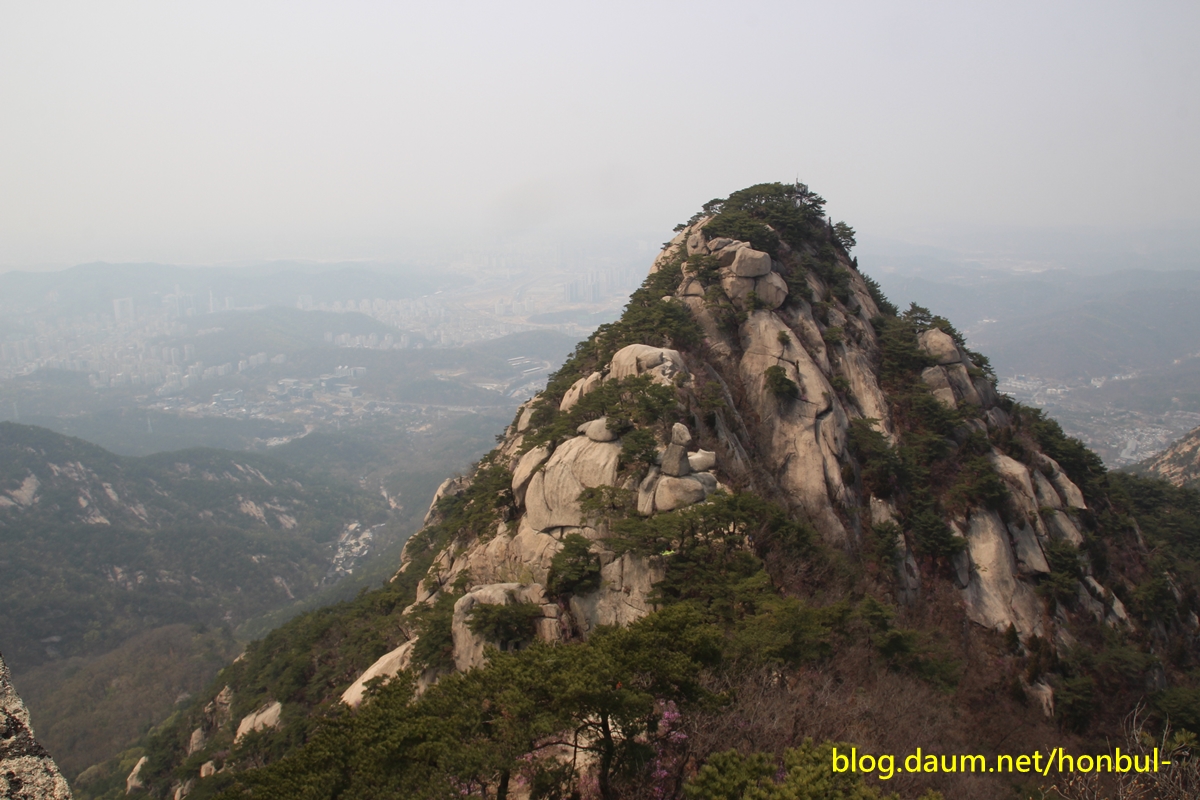 엄지바위(동자바위) 중간 왼쪽에 진달래꽃이 핀 게 보인다.