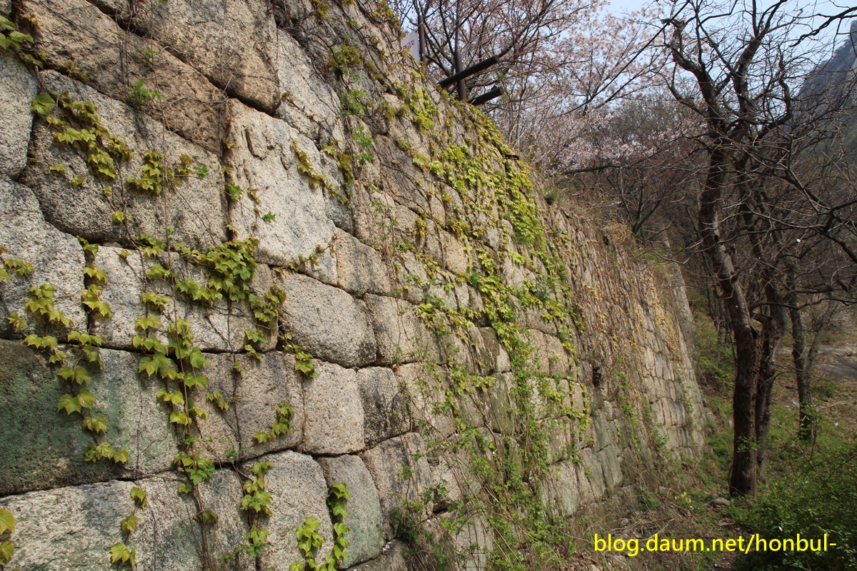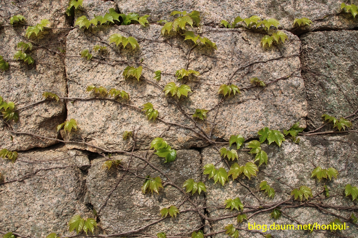 중간에 성벽을 넘어 내려가다 만난 담쟁이 풀이 봄을 만나 기지개를 켜며 빠르게 성장하고 있다.