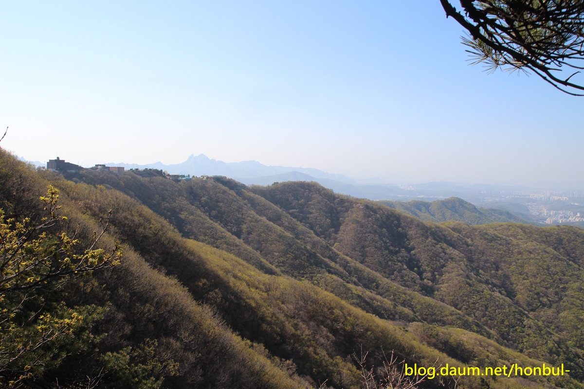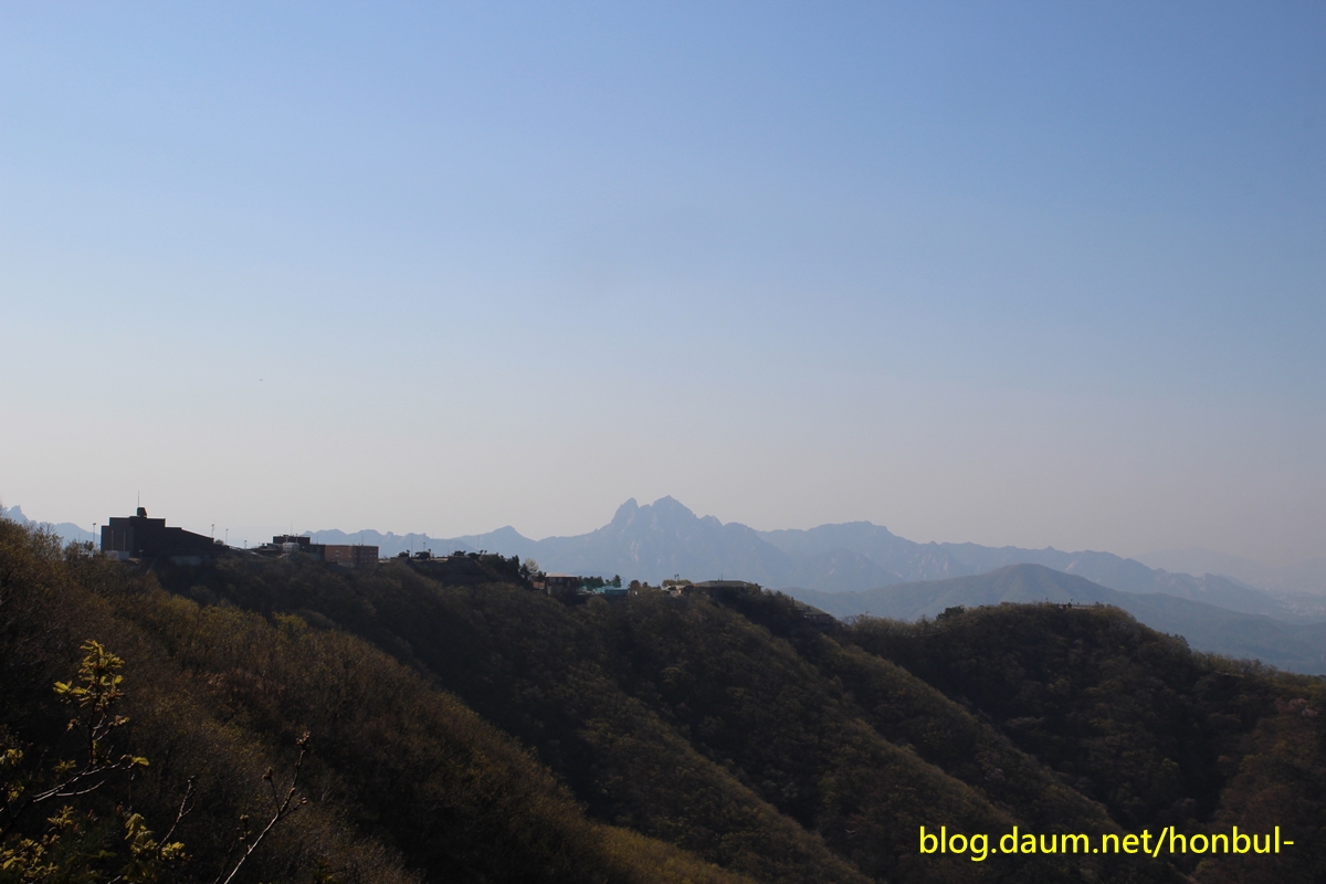 계명산과 개명산 사이를 가로지르는 군부대 뒤로 북한산 정상이 보인다.