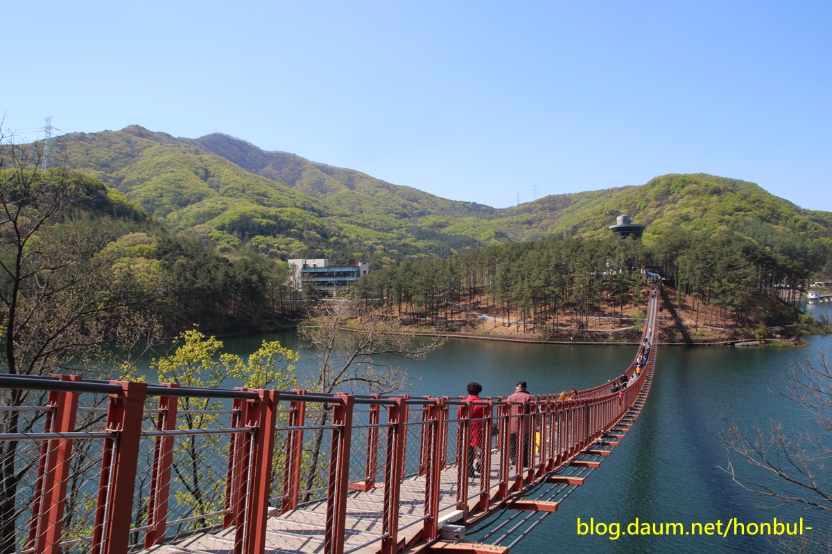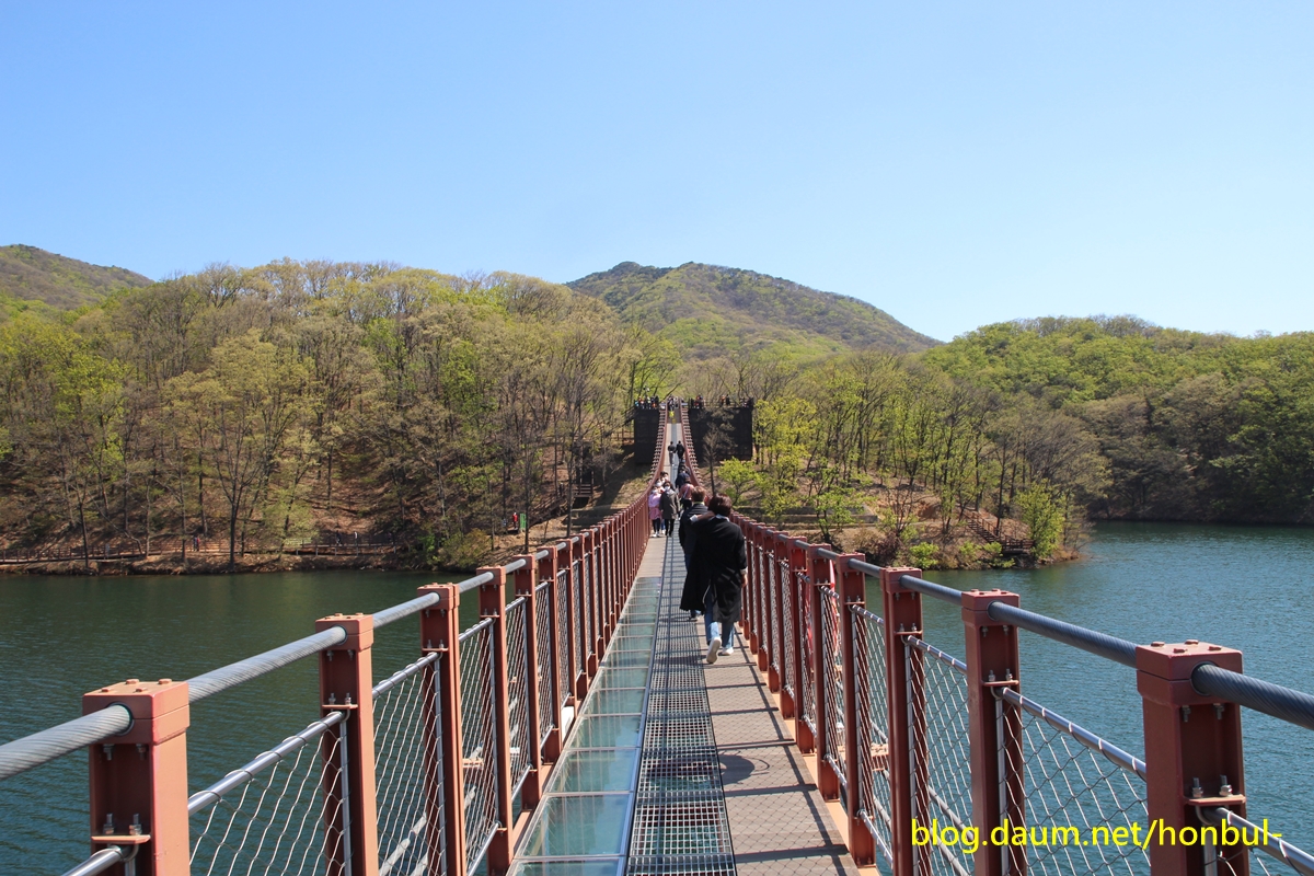 출렁다리를 건널 때 좌우 흔들림이 좀 있어 다소 비틀거리며 건너게 된다.