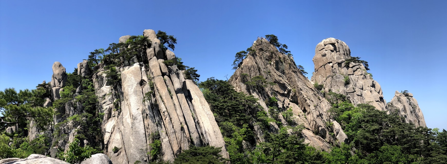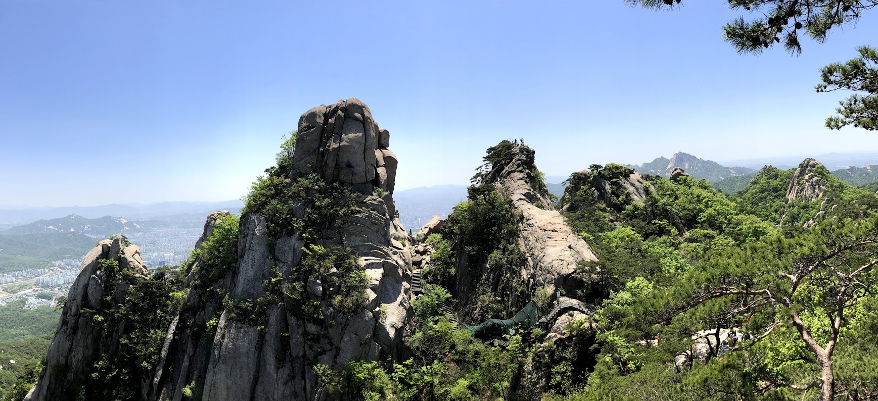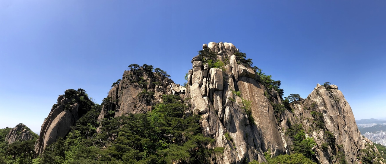 여기서 비장의 무기인 핸드폰 파노라마 기능을 이용해 뜀바위와 신선대, 자운봉, 연기봉을 한 화면에 집어넣는다.