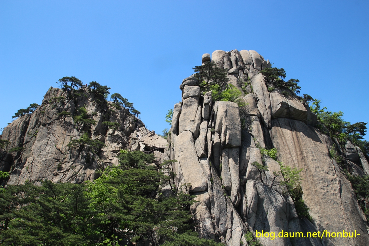 에덴의 동산에서 보는 만장봉과 선인봉은 좀 전 신선대나 이브의 동산에서 보던 모습과 많이 다르다.