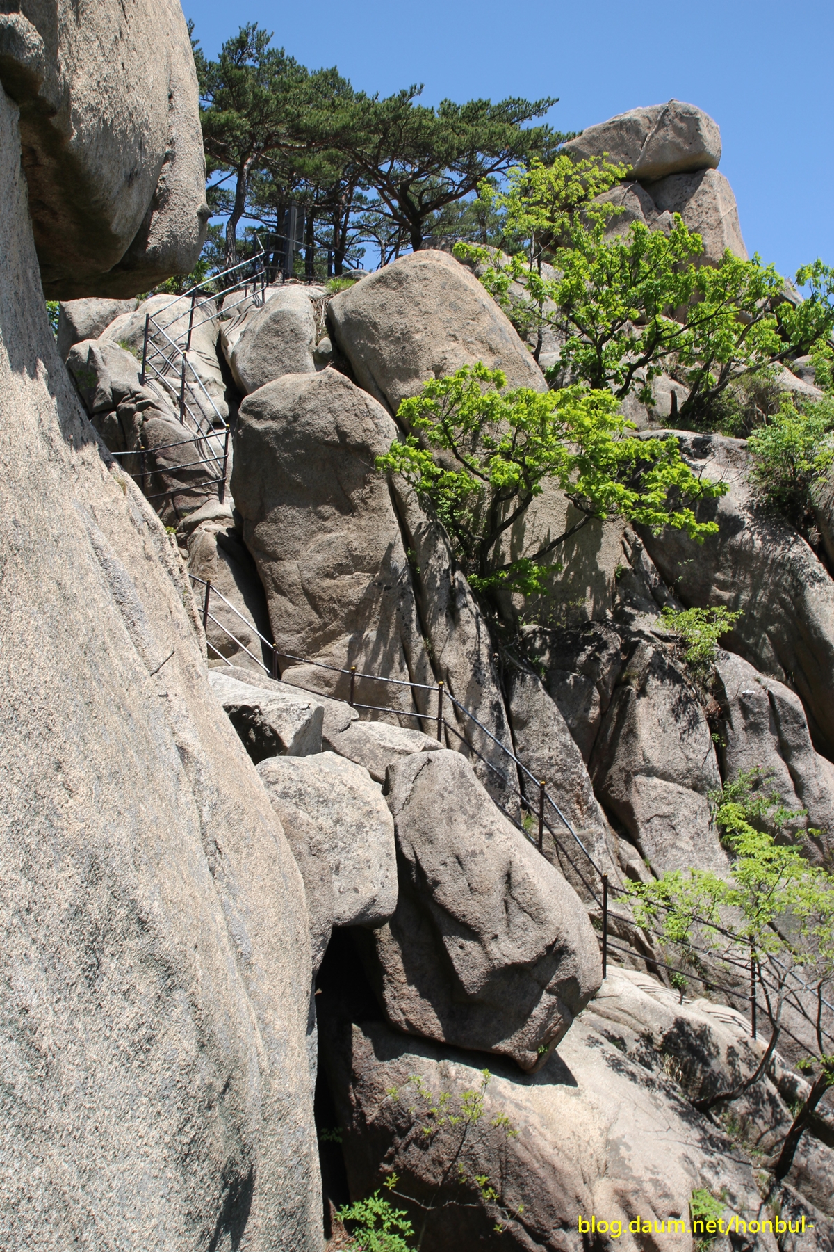 포대능선 정상으로 오르는 계단과 우측은 Y계곡 상단의 바위다.