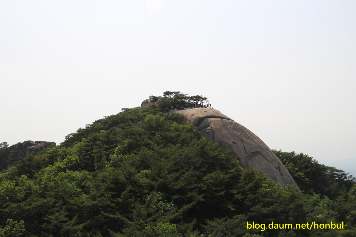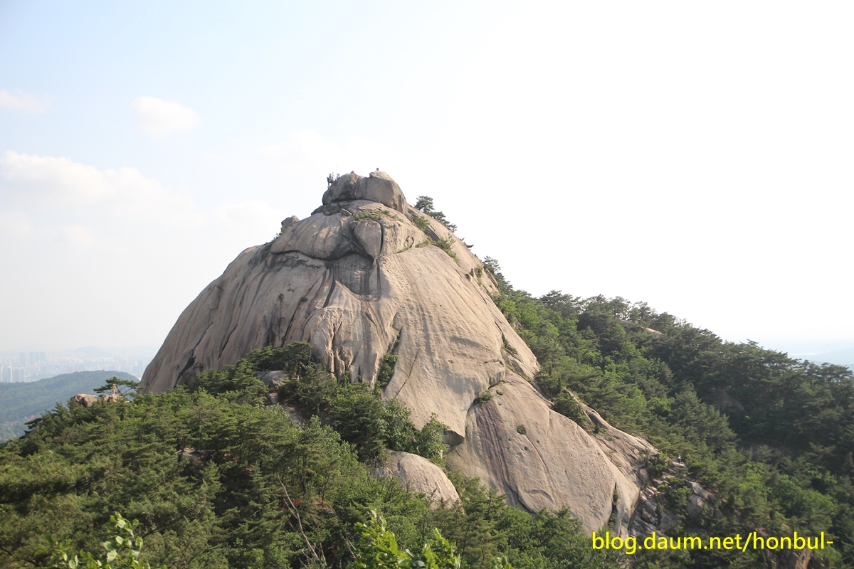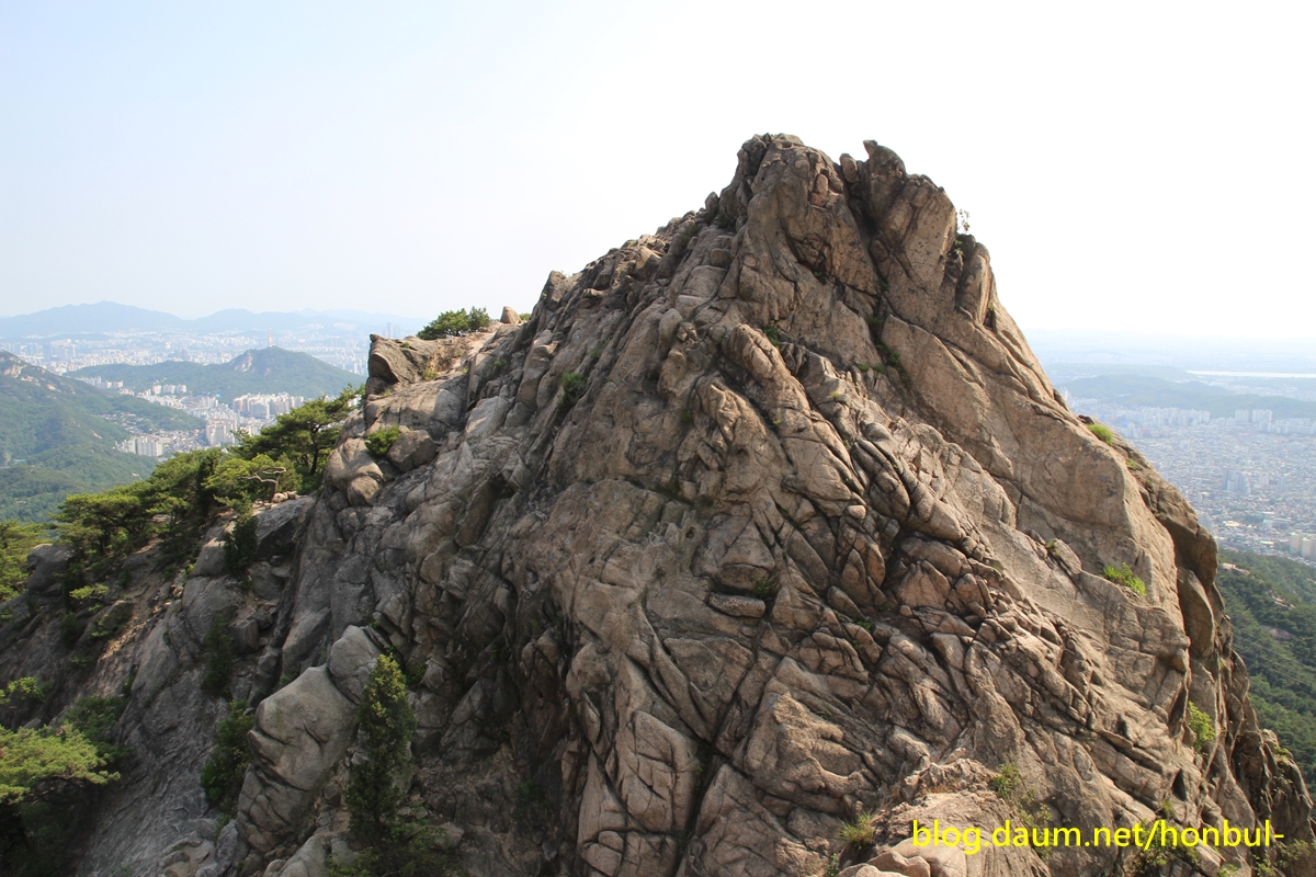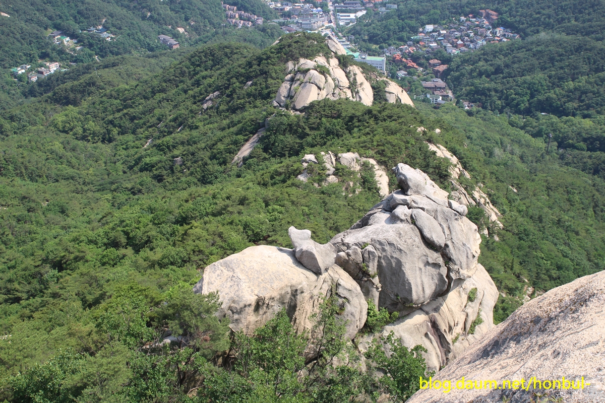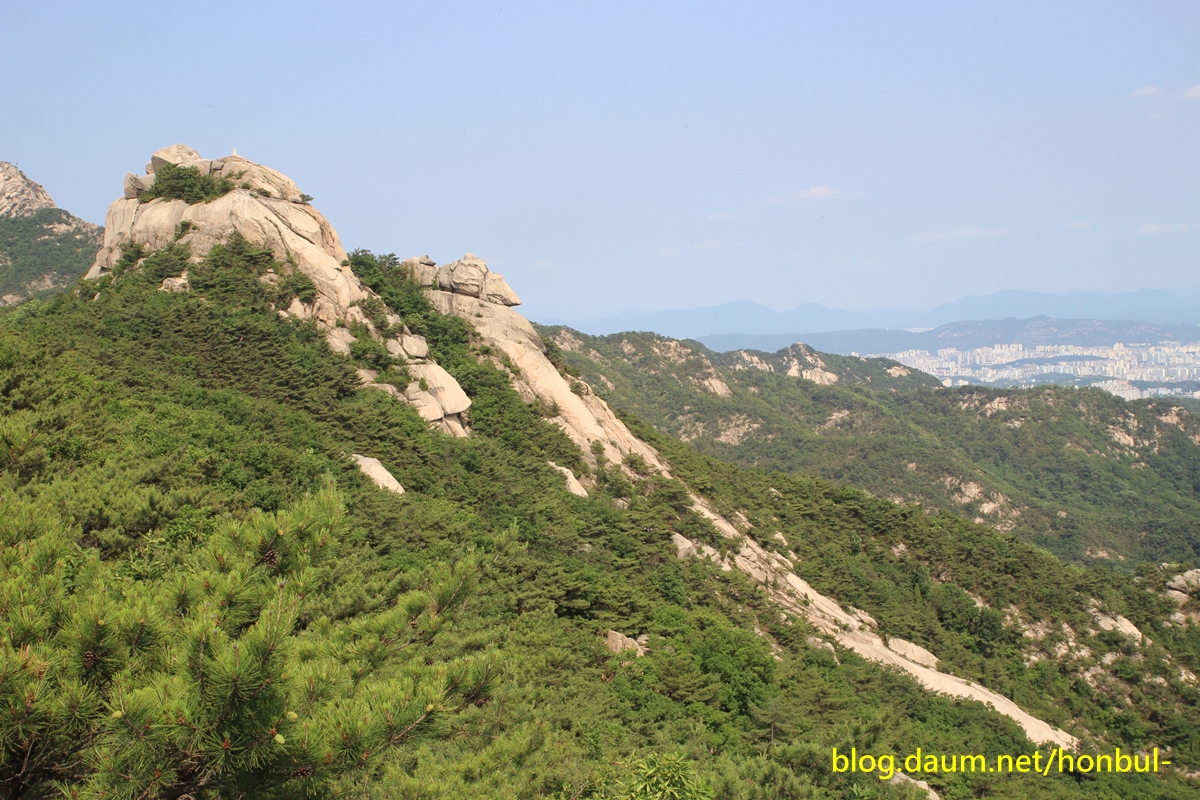 의상능선 너머 북한산 정상인 백운대 주변으로 만경대와 노적봉, 용암봉이 조망된다.