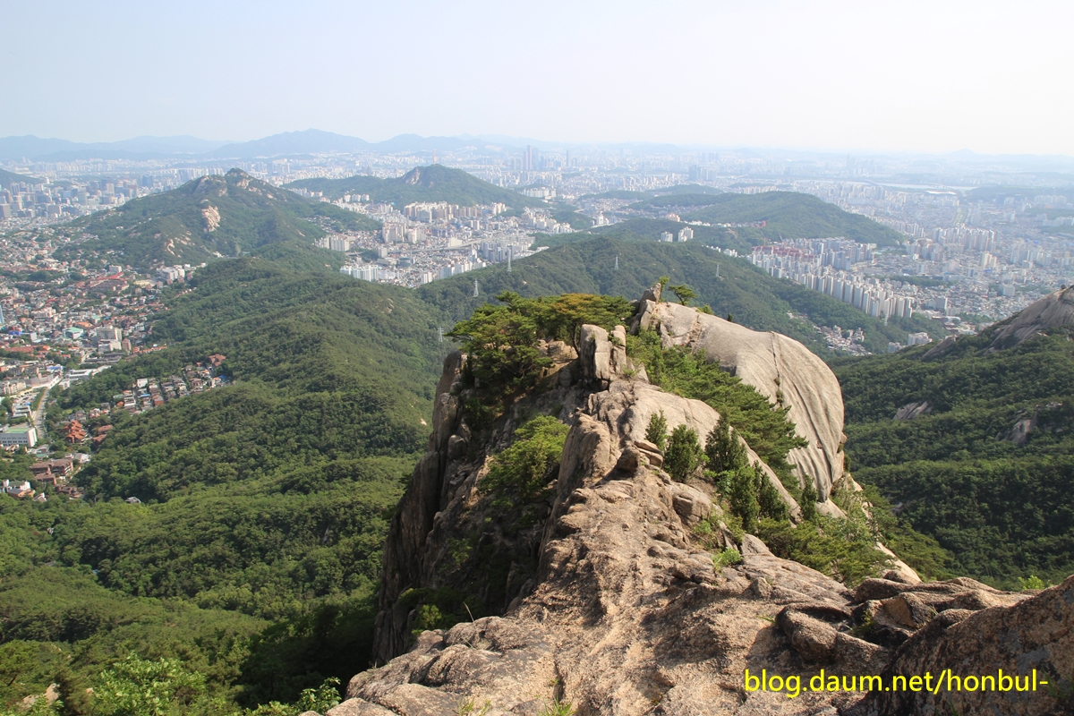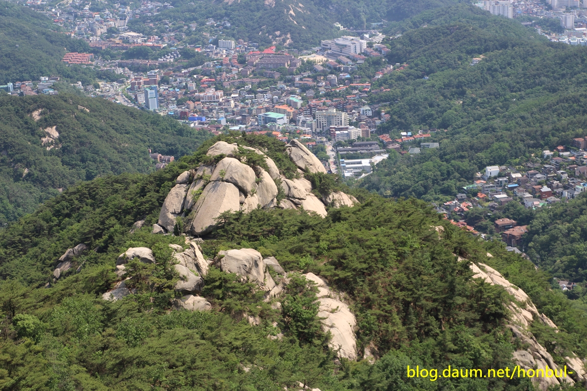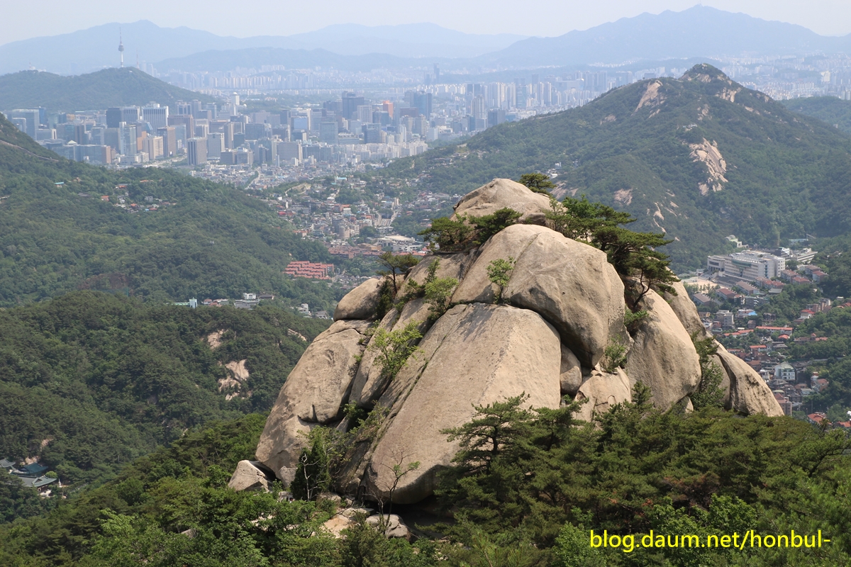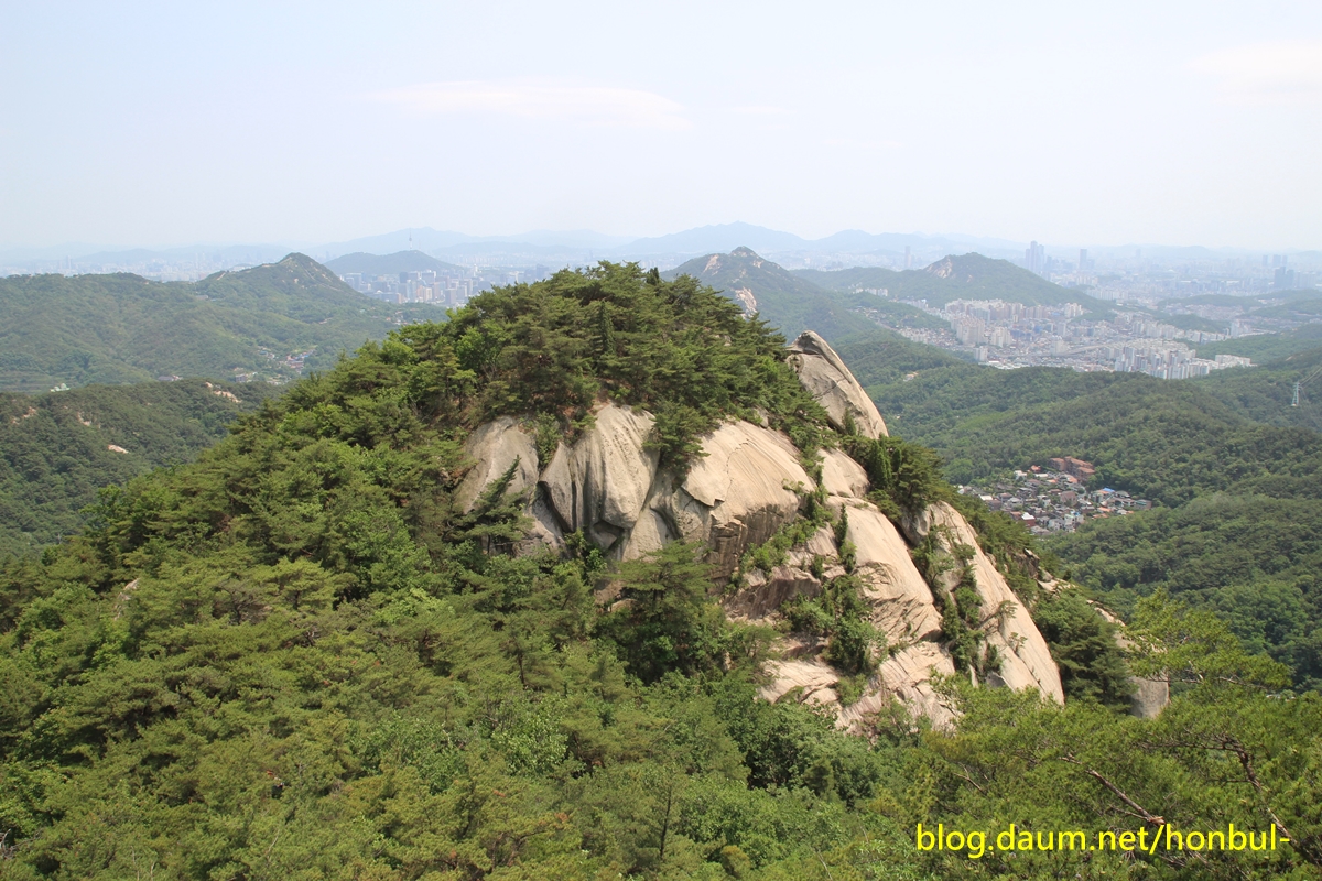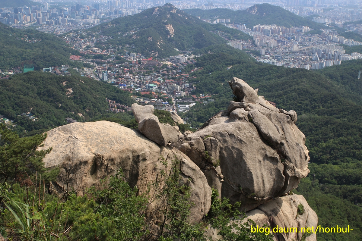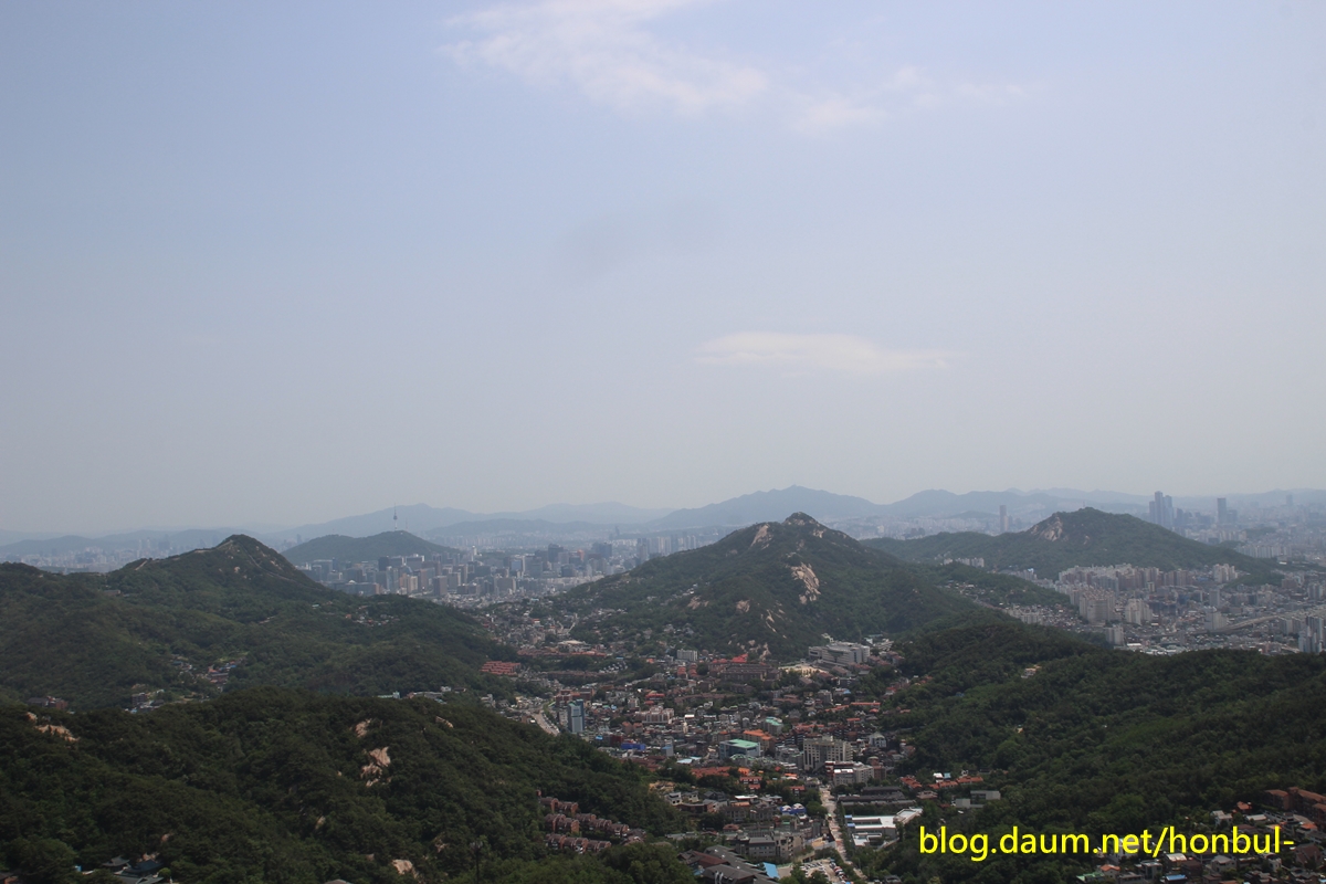 앞쪽으로 파도처럼 물결치는 능선은 왼쪽 봉우리부터 북악산-인왕산-안산이고,