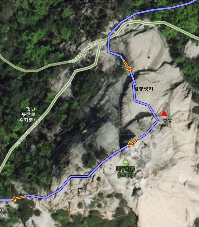 잉어바위를 끝내고 비봉은 실선을 따라 정상에 바위가 놓인 굴로 빠져 나갈 것이다.