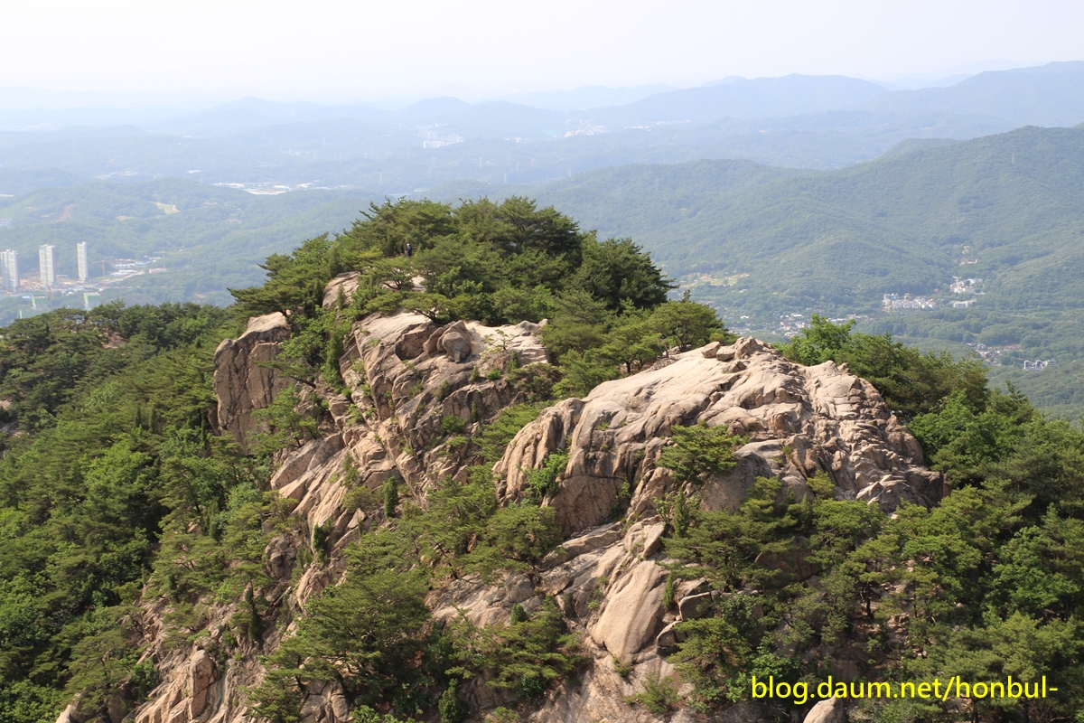 저 둥근 바위 앞쪽 소나무 많은 곳으로 하산해 족두리봉으로 이동할 예정이다.
