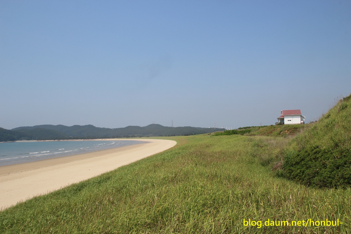 물은 푸르고 해변의 고운 모래는 활처럼 휘었다.