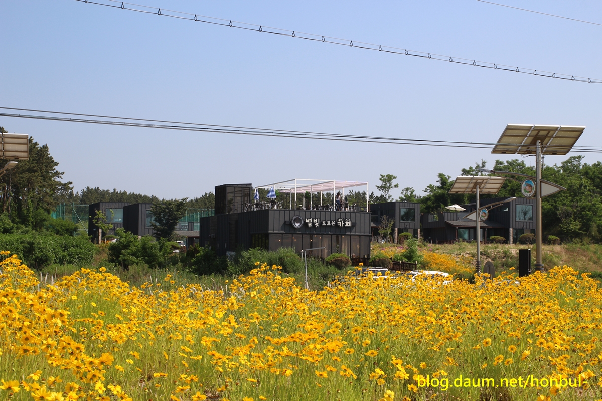 금계국 꽃이 화려하게 피어 주변 카페를 더 멋지게 만든다.