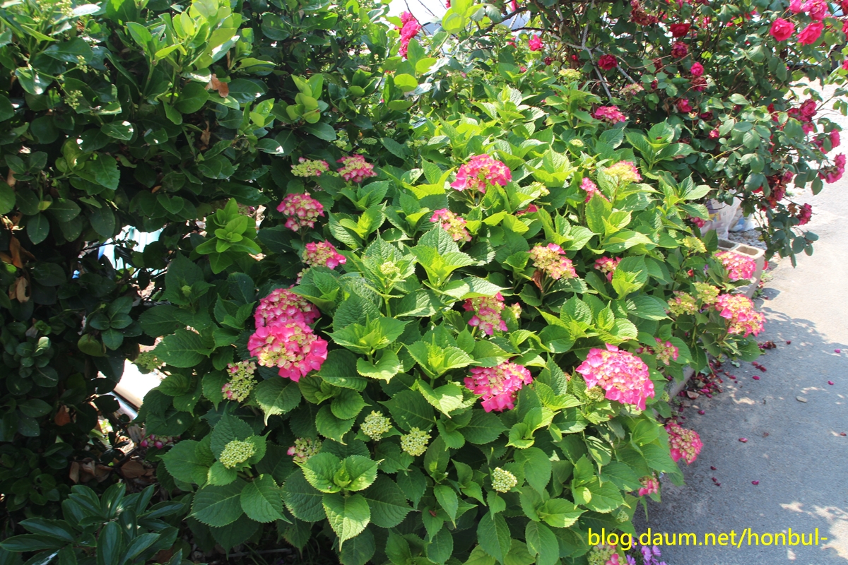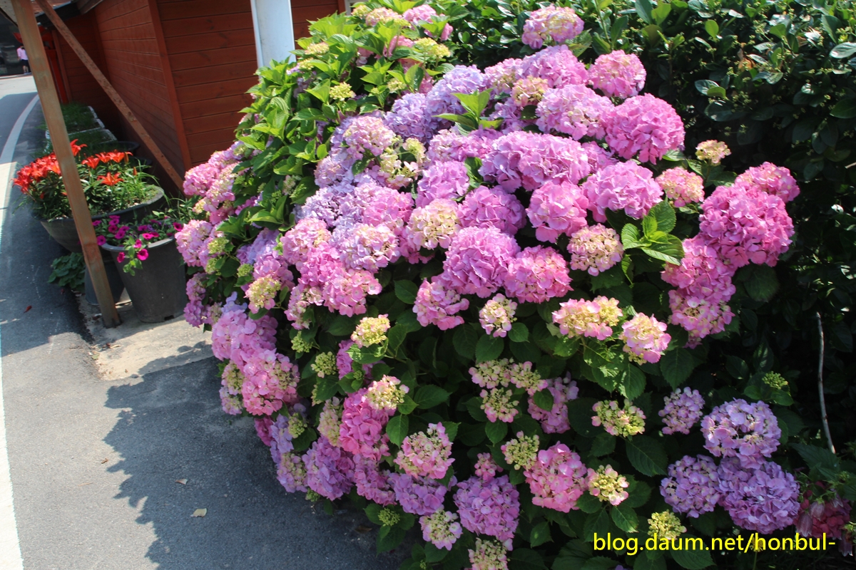 잠깐 마을길로 들어서니 여러 종류의 수국이 한창 피었다.