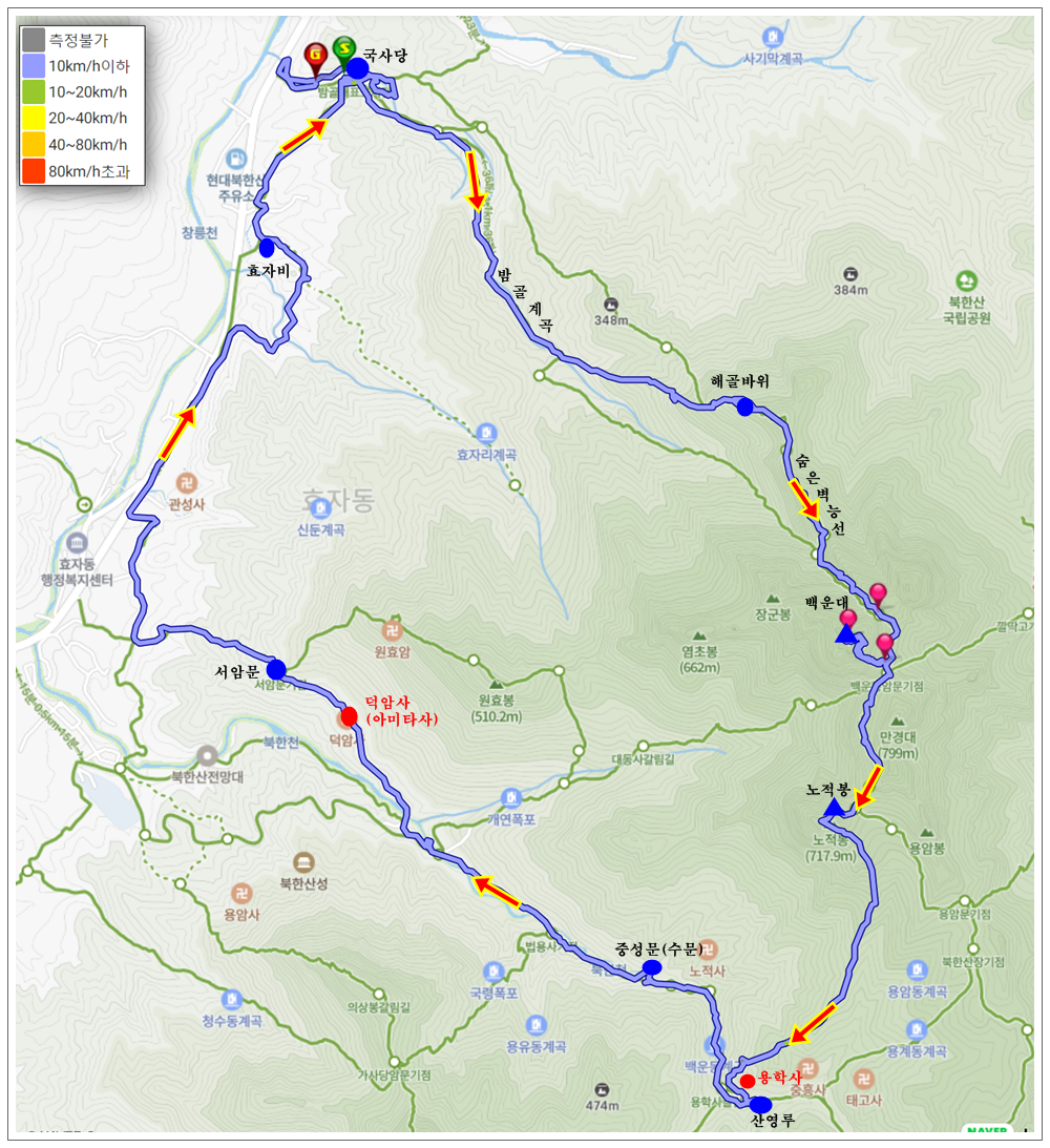 국사당에 주차하고 숨은벽능선을 타고 백운대 정상까지 4.2km 거리를 두 시간 47분 만에 도착했다.