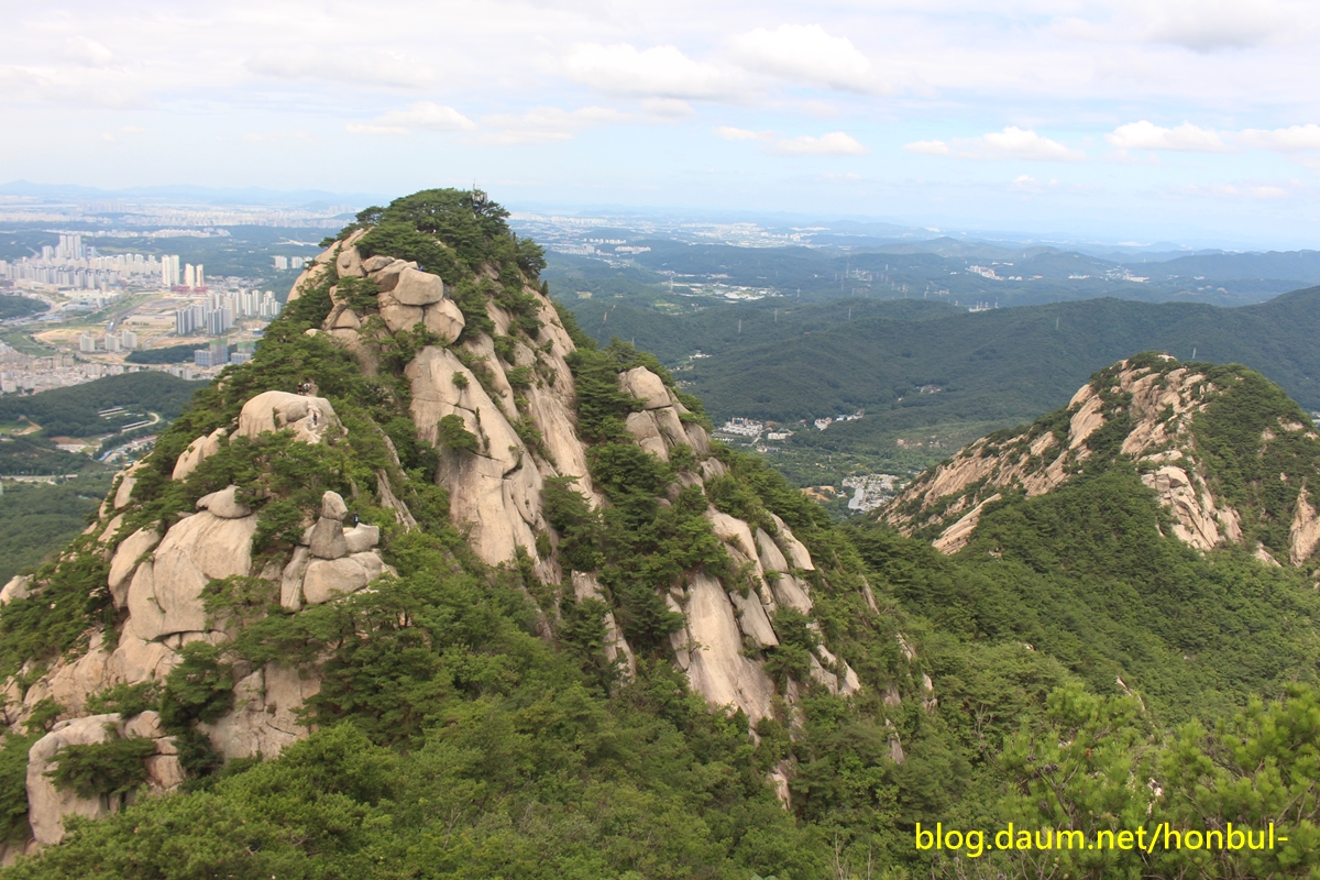 용출봉을 내려가며 테트리스 바위를 우회하는 지능선으로 내려가며 잡은 의상봉과 원효봉이다.