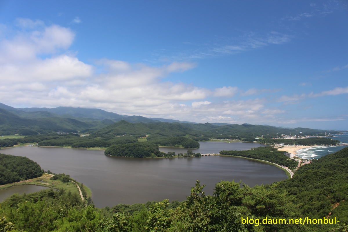 응봉에서 바라보니 사주로 연결된 화진포가 이색적으로 보인다.