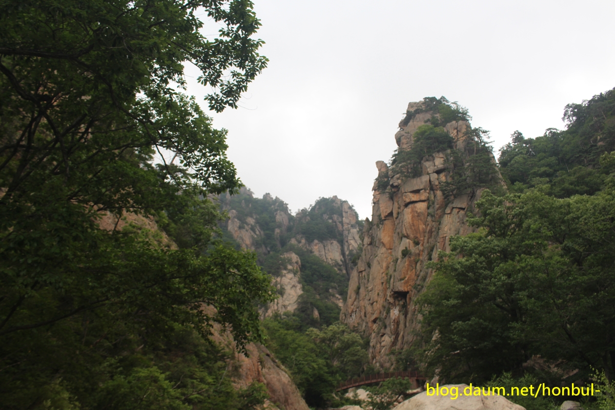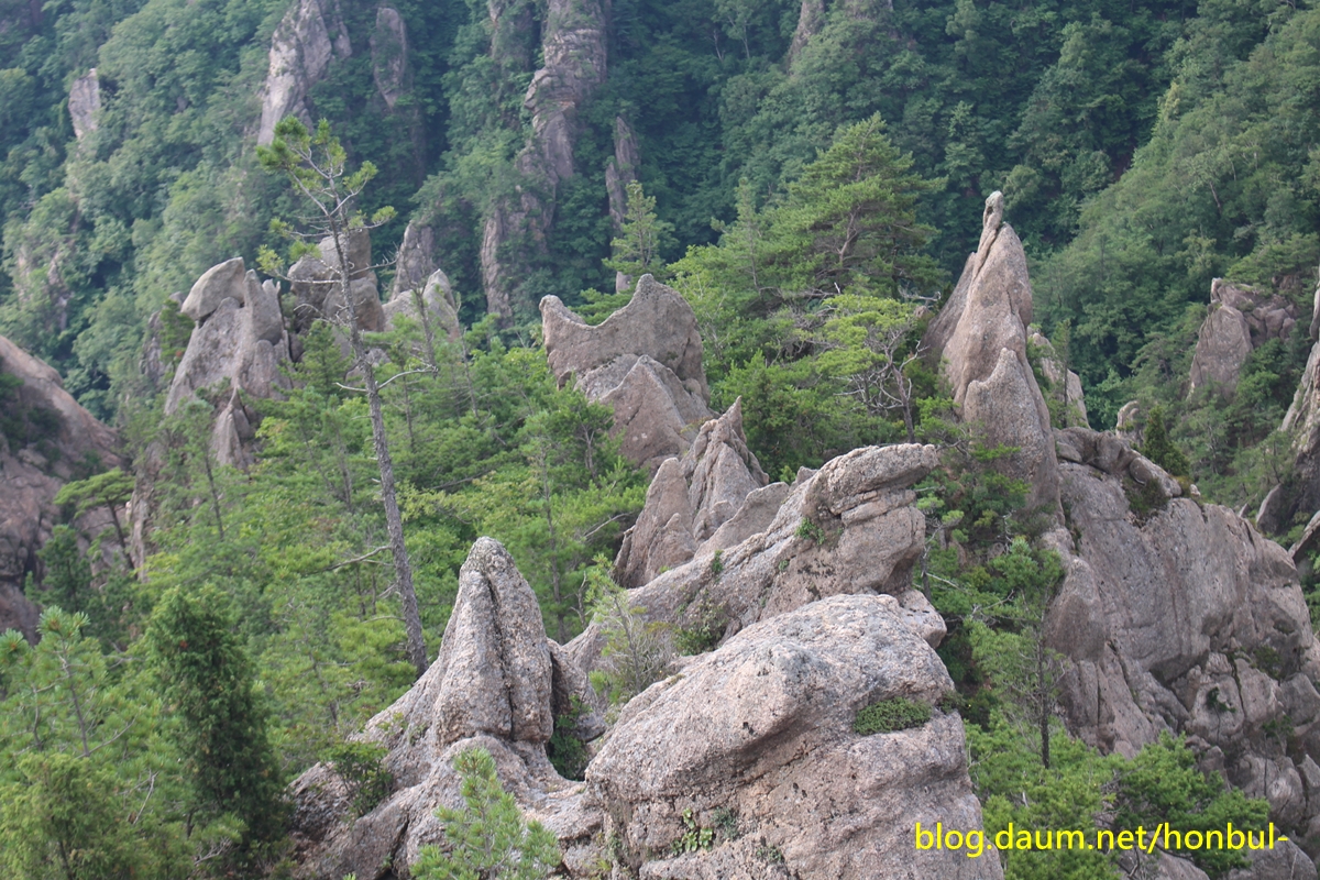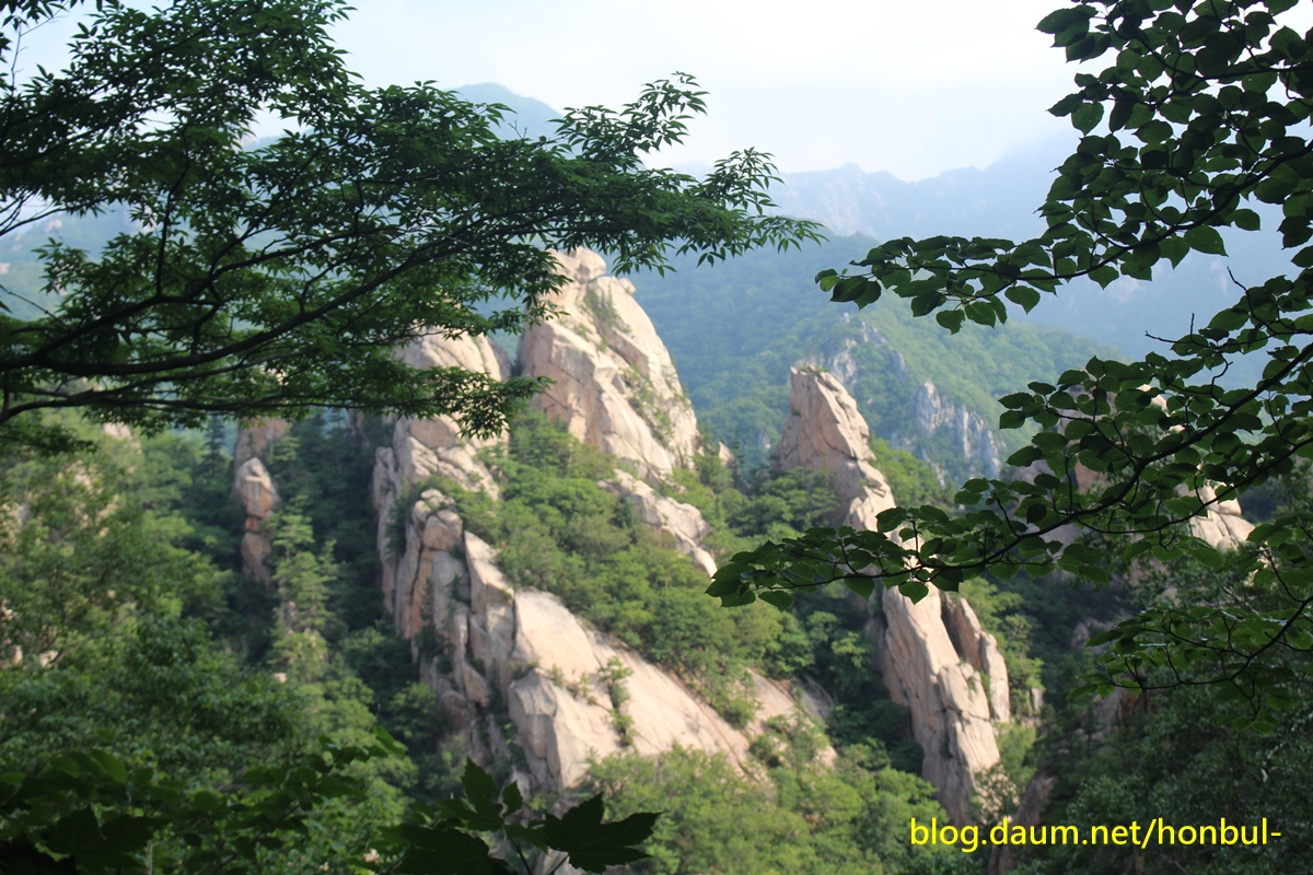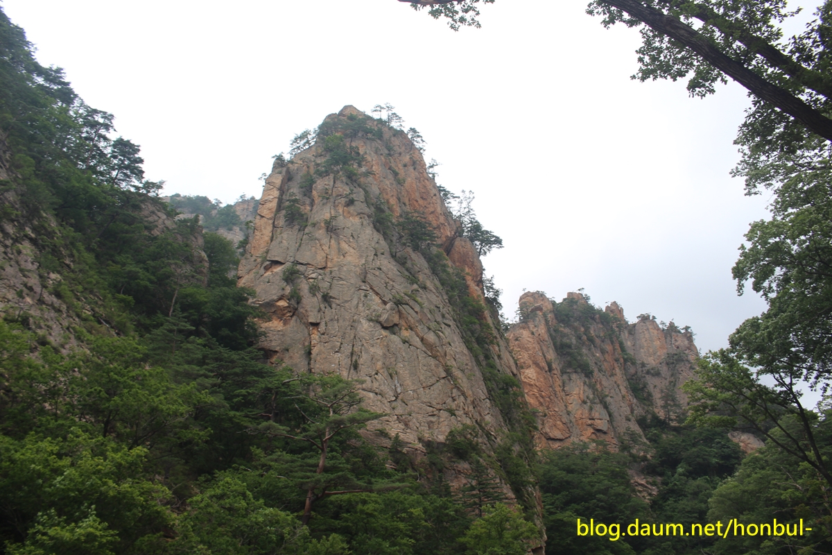 계곡을 걸으며 잠깐 고개를 들면 도처에 암봉이 만들어 내는 비경이 천지다.