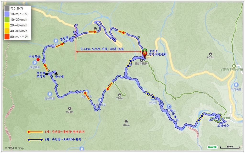 지도를 검색하니 내리막 코스에 있는 주전골 탐방센터까지 2.4km 밖엔 안 된다.