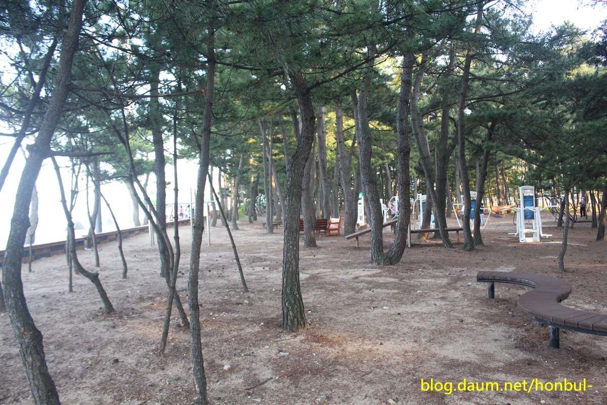 백사장에는 목재 산책로가 조성되어 있고, 백사장 뒤편에 송림이 잘 가꾸어져 있으며,