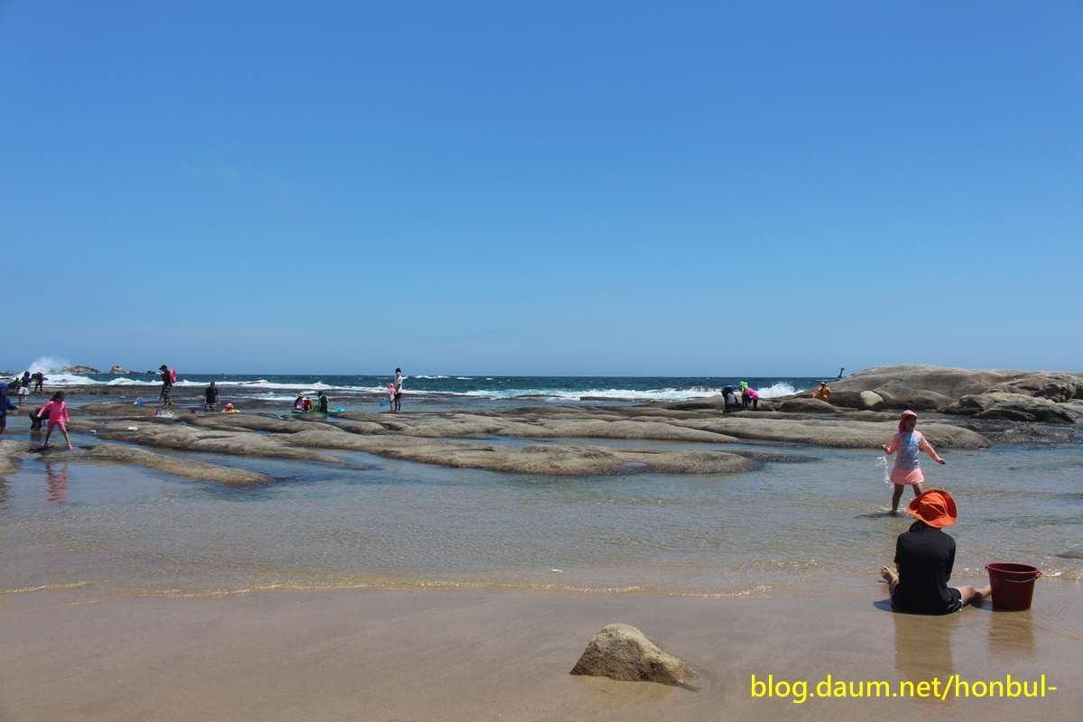 제법 긴 갯바위의 물고랑은 성수기 때 아이들 차지겠다.