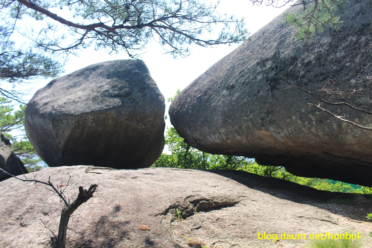 그 아래 작은 나무가 가린 바위는 뱀이 똬리를 튼 형상으로 소개한다.