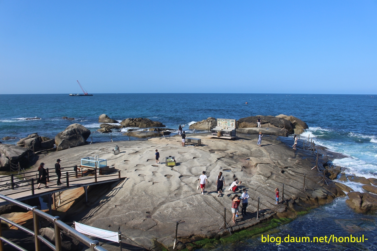 조금 더 걸어 들어가면 넓은 바위가 바다 한가운데에 있다.