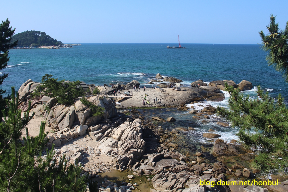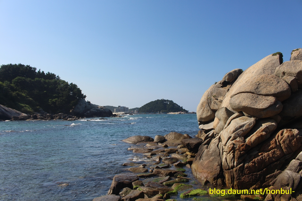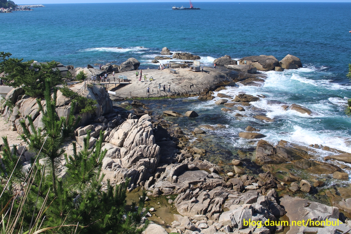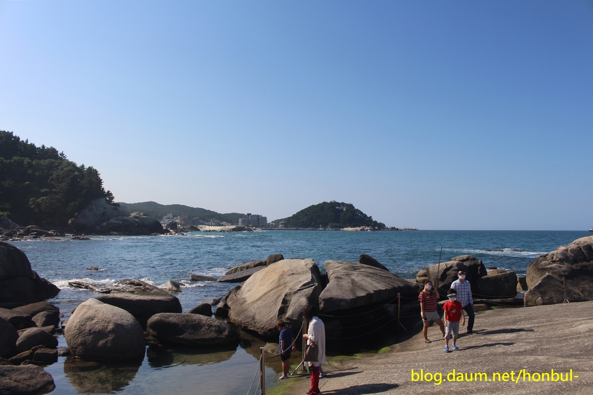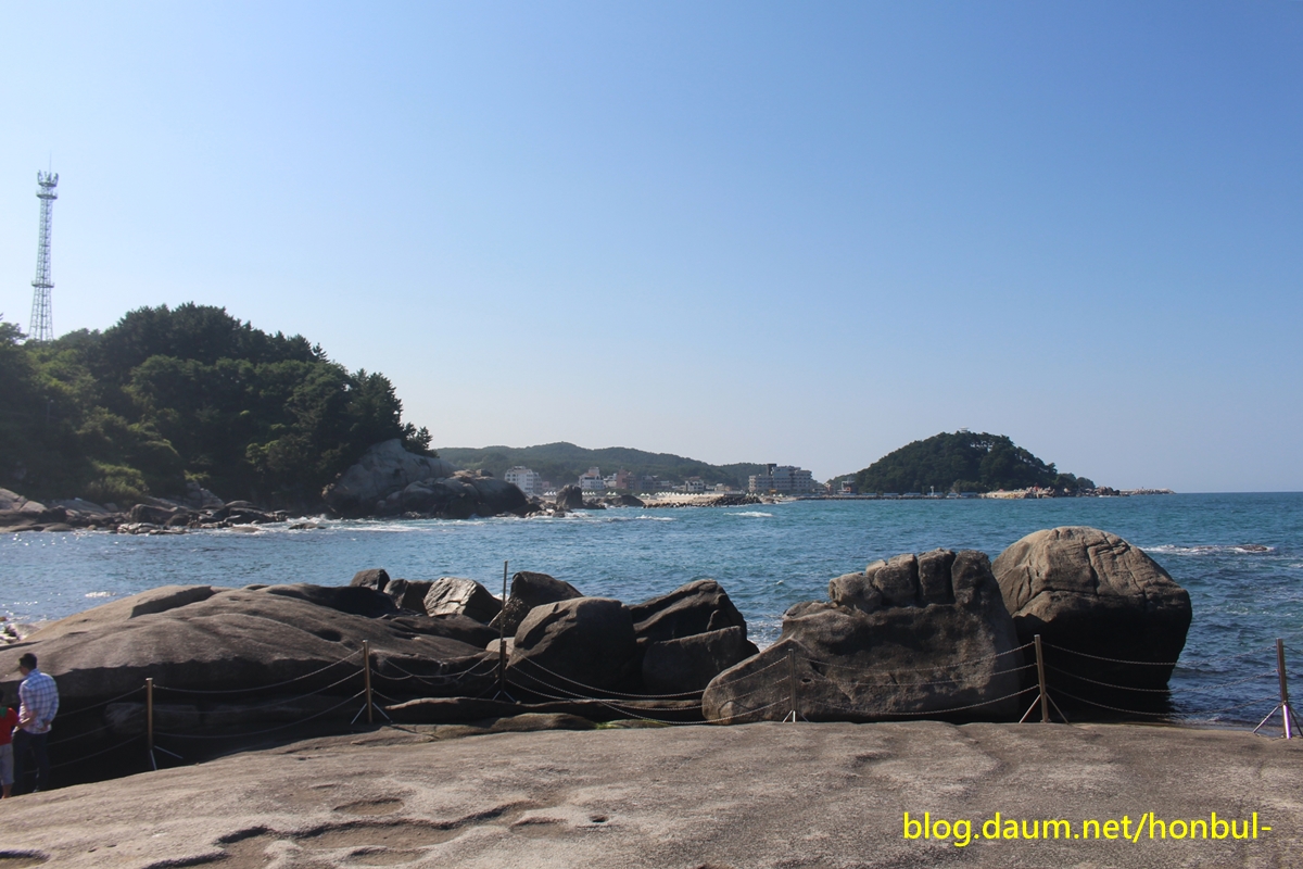 "바닷가 100평 남짓한 바위인 "연화법당"에 오르면 200m 앞 왼쪽 해변으로 기다란 바위가 보인다.