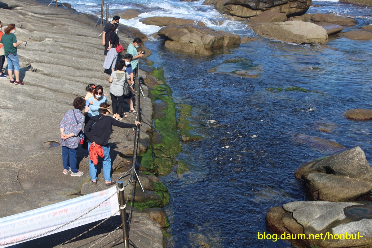 바닷가 연화법당의 물고기에게 지속적인 보시를 해 물고기를 구경하는 것도 재미있다.