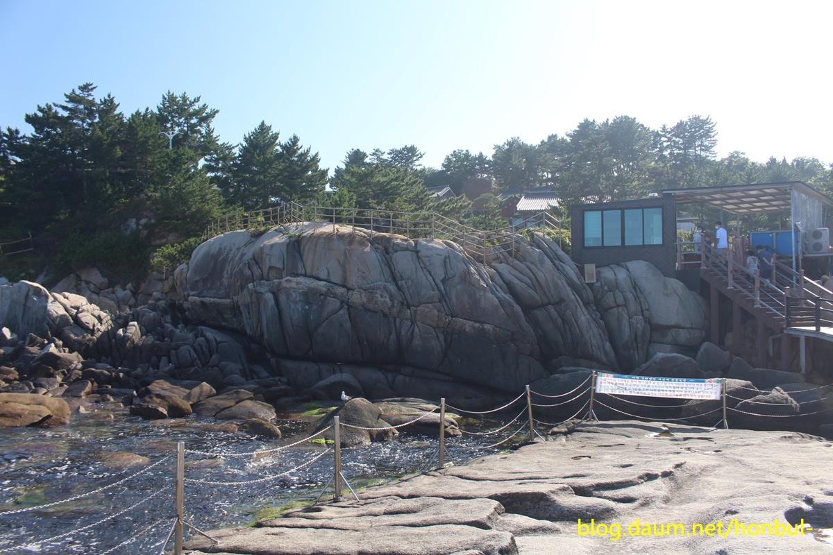 바닷가 100평 남짓한 바위인 "연화법당"에 오르면 200m 앞 왼쪽 해변으로 기다란 바위가 보인다.