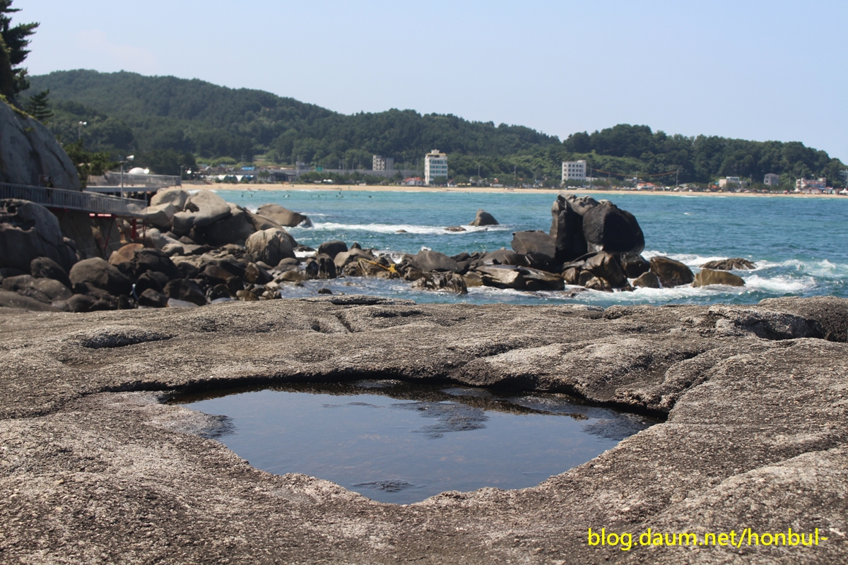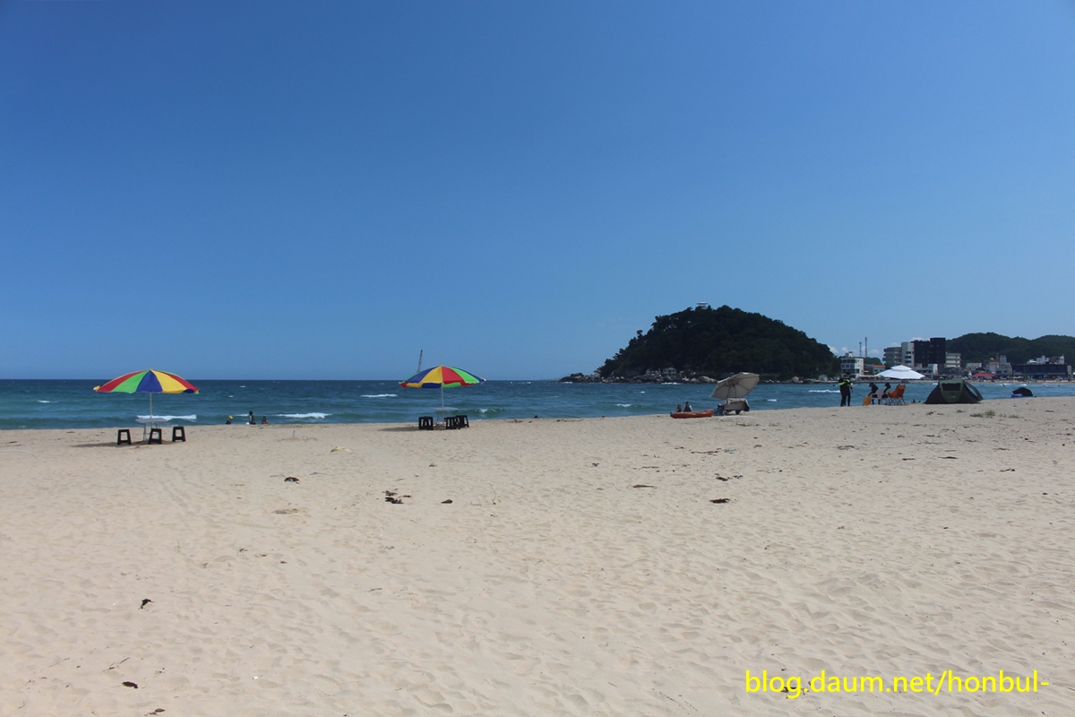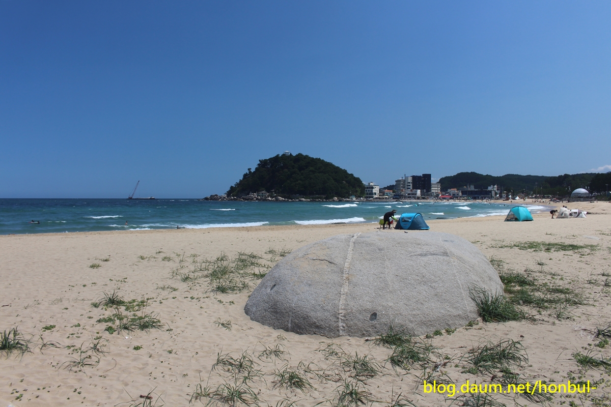 이 해변을 반을 나눠 위쪽은 동산 해수욕장, 죽도쪽은 죽도해수욕장이다.