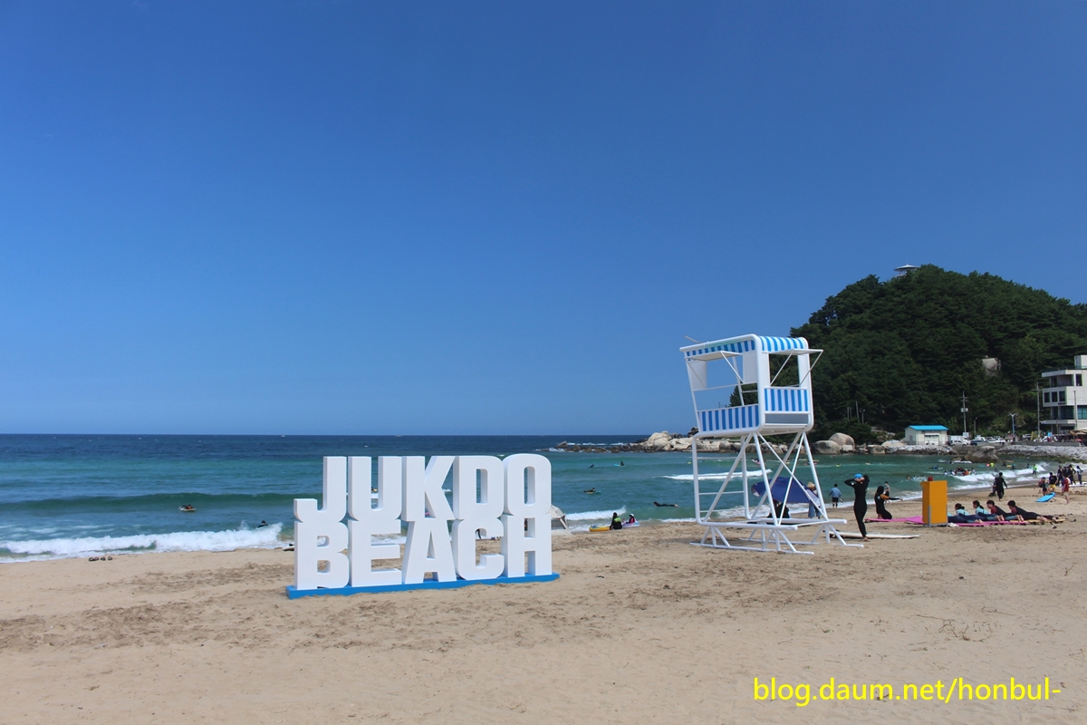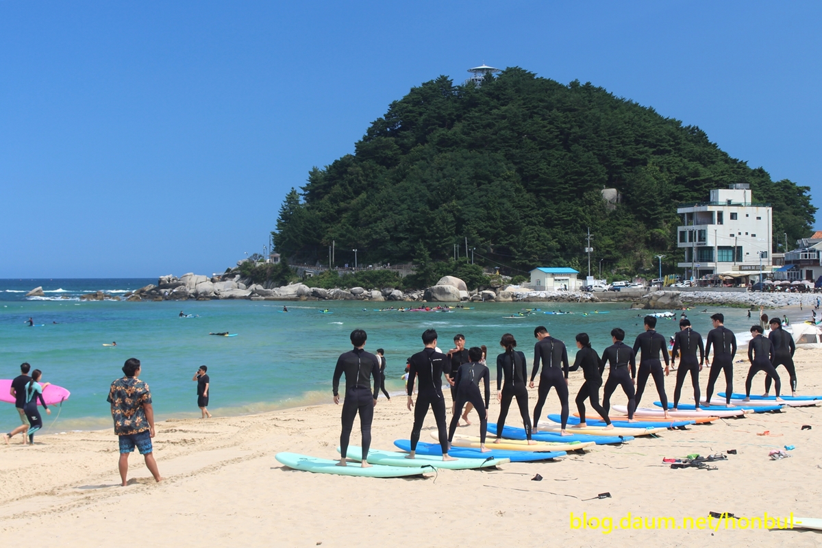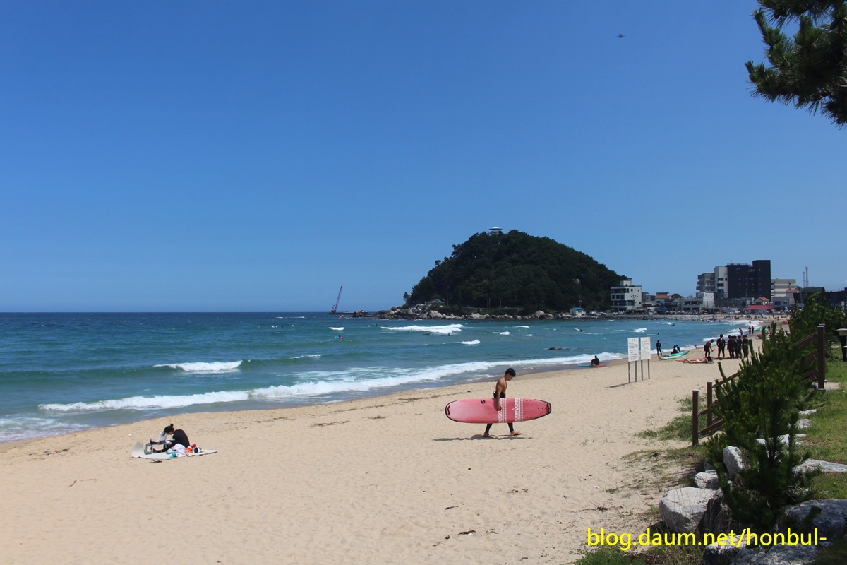 유난히 서퍼를 배우는 젊은이들도 붐비는 동산, 죽도 해수욕장은 또 하나의 명물인 죽도가 있다.
