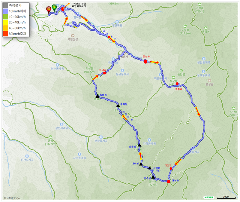들머리인 북한산 탐방지원센터가 해발 30여 m에 불과한 데다, 바윗길이라 의상봉까지 오르는 게 무척 힘들다.