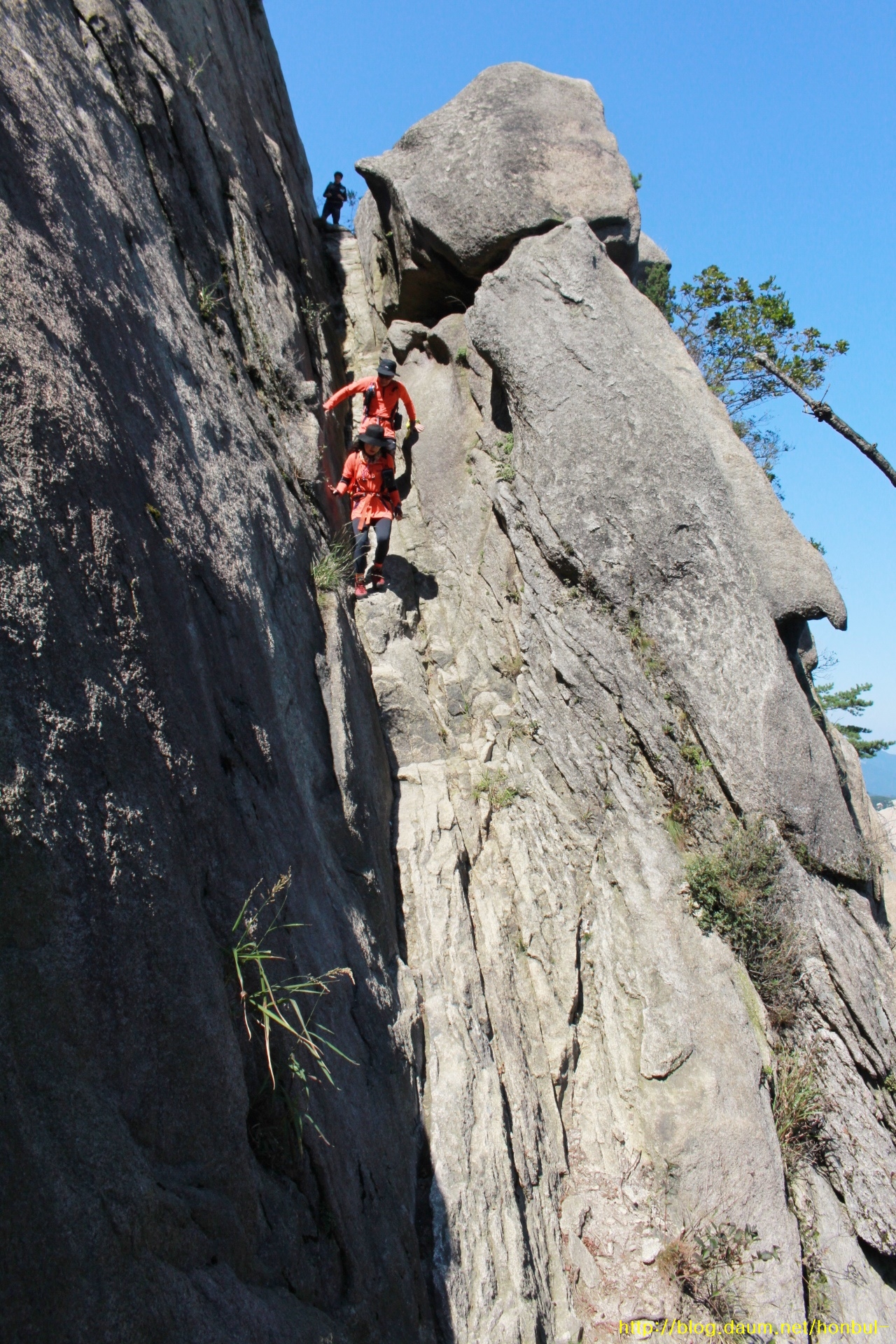 에스컬레이터 바위에서 통천문까지 약 30여 m는 까마득한 절벽이나 발 디딜 정도의 공간이 있다.