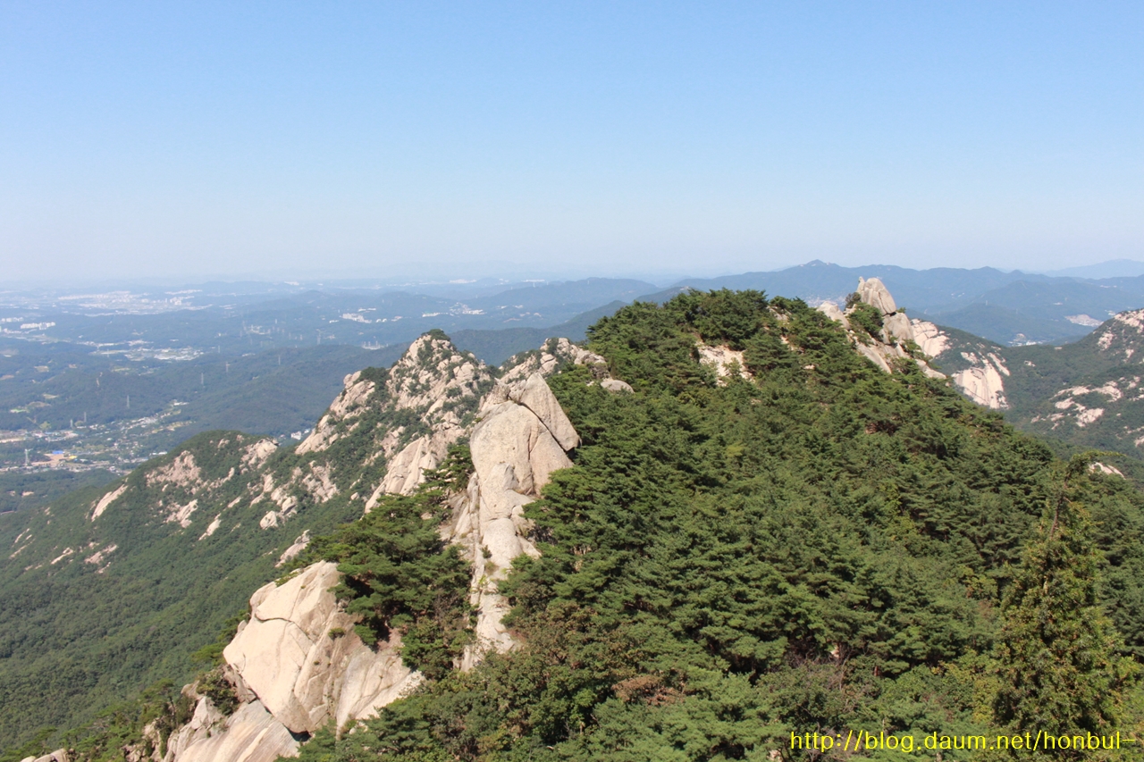 하산 방향의 왼쪽은 나한봉, 증취봉, 용혈봉, 용출봉, 의상능선이 굴비 엮이듯 몰려 있고,