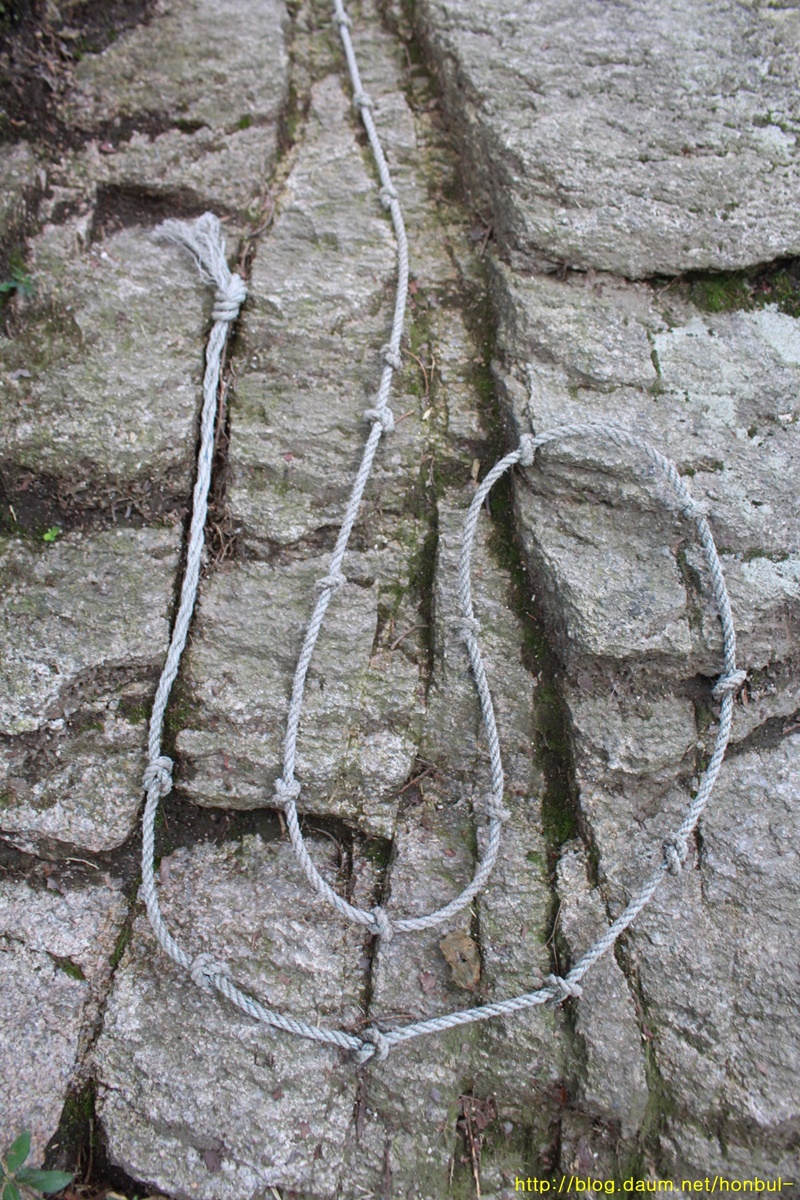 내려가며 어느 바위에 걸린 로프는 꼼꼼하고 촘촘한 간격으로 매듭을 지었다.