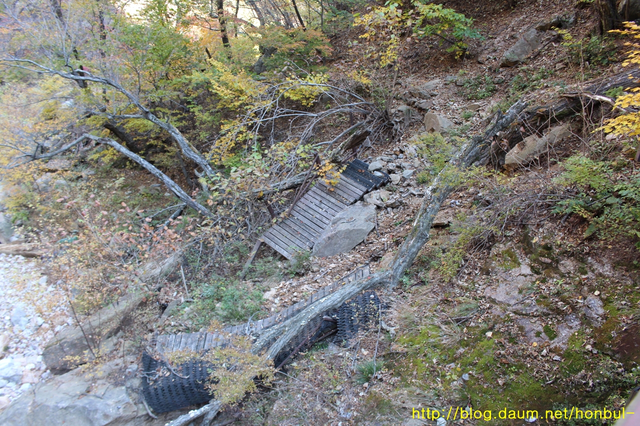 중간중간 더러 낙석을 보기도 했고, 나무데크 계단도 훼손된 곳이 많다.