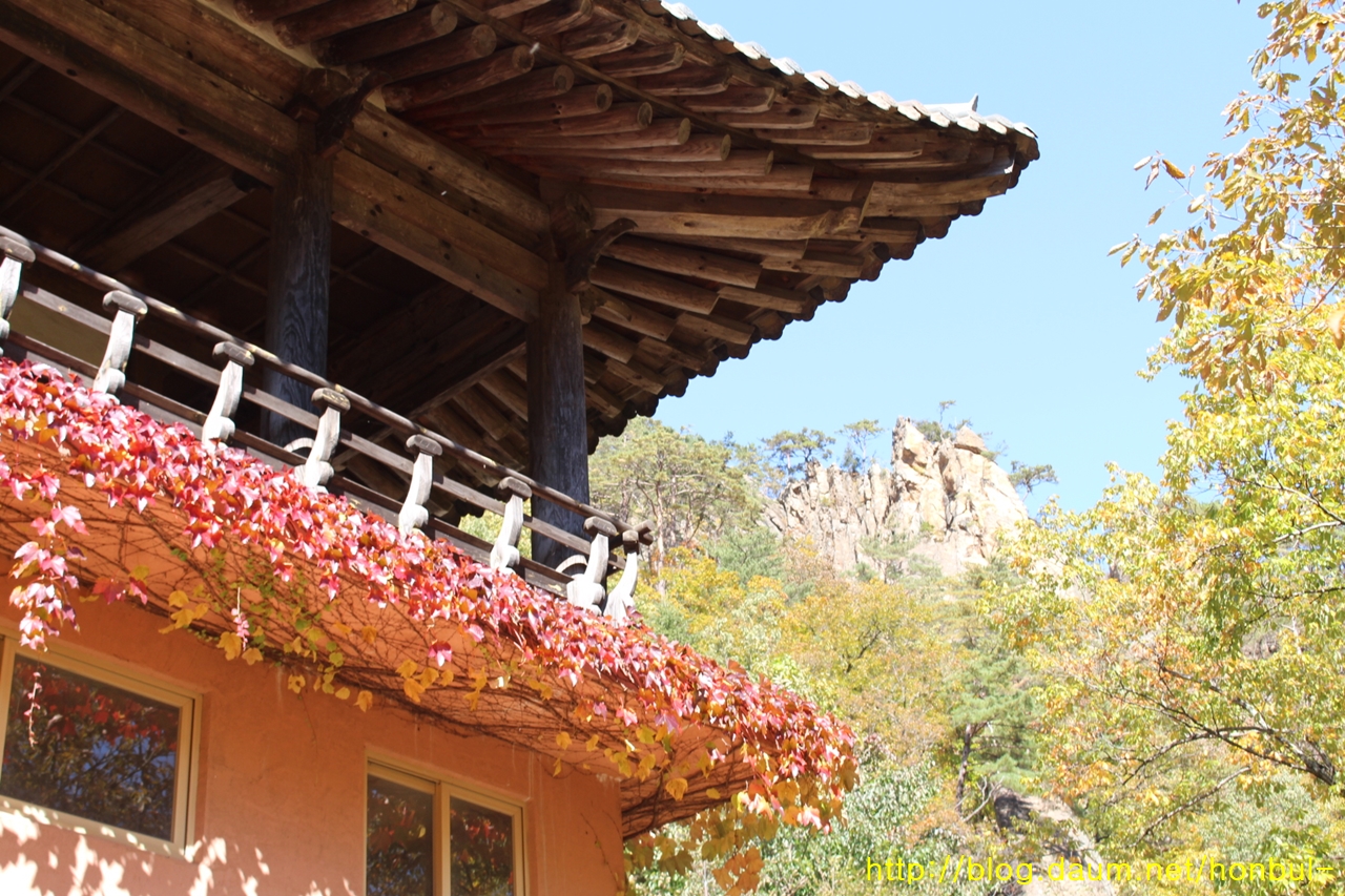 성국사 테라스를 물들인 담쟁이 풀이 사찰의 적막을 붉게 물들인다.