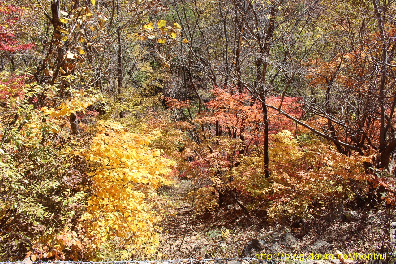 산 정상은 이미 낙엽까지 진 상태이고, 중간 지점이 단풍 절정이다.